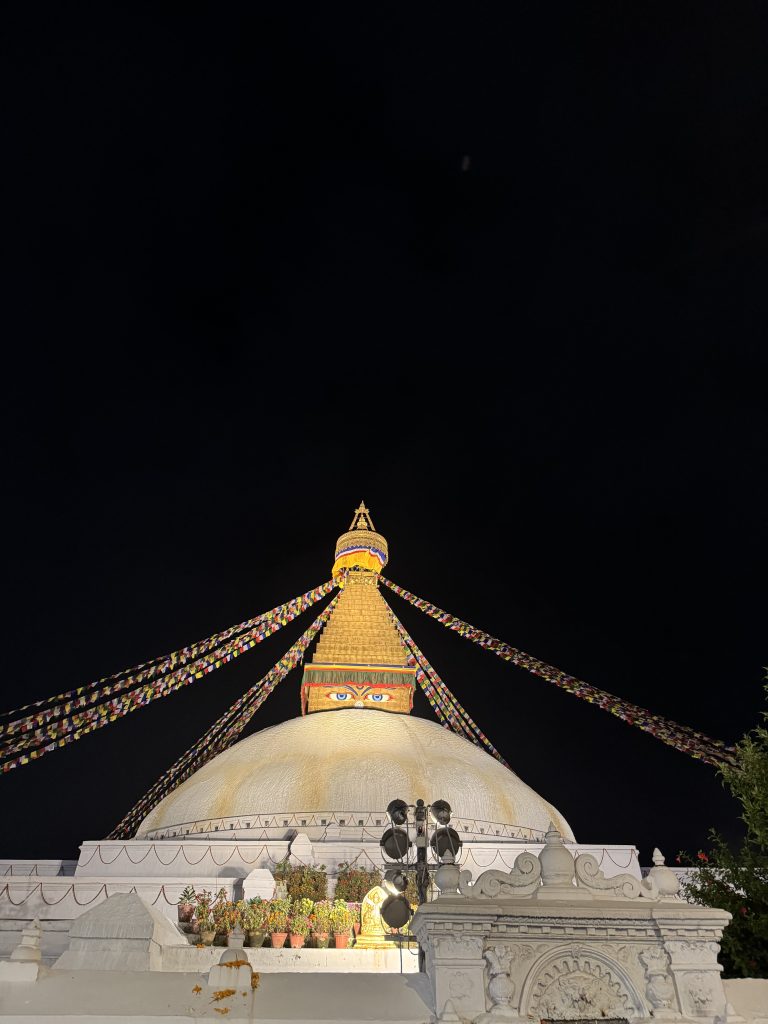 Alternative Text: A nighttime view of a large stupa adorned with colorful prayer flags.