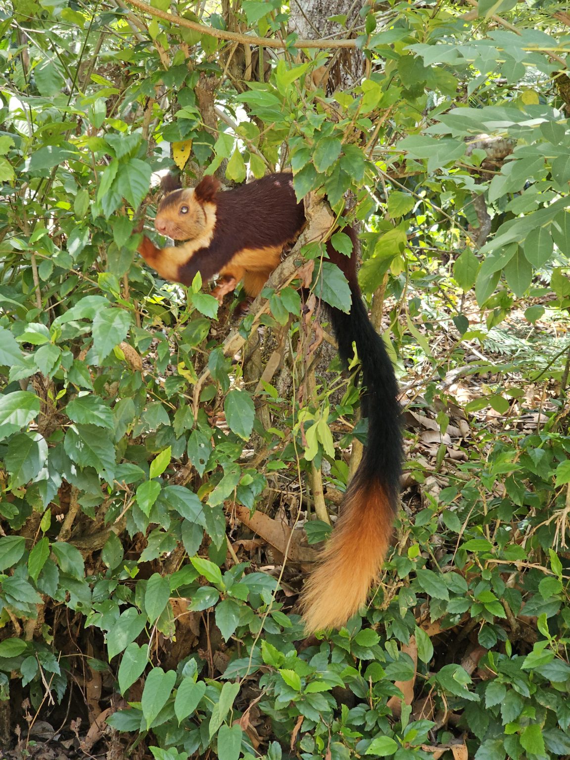 Alternative Text: An Indian giant squirrel, also known as a Malabar giant squirrel, perched in a tree amidst lush green foliage. The squirrel’s distinctive coloration, with a dark brown back, creamy-beige face and chest, and a bushy tail that transitions from dark brown to orange, is clearly visible. Captured from Thirunelli, Wayanad.