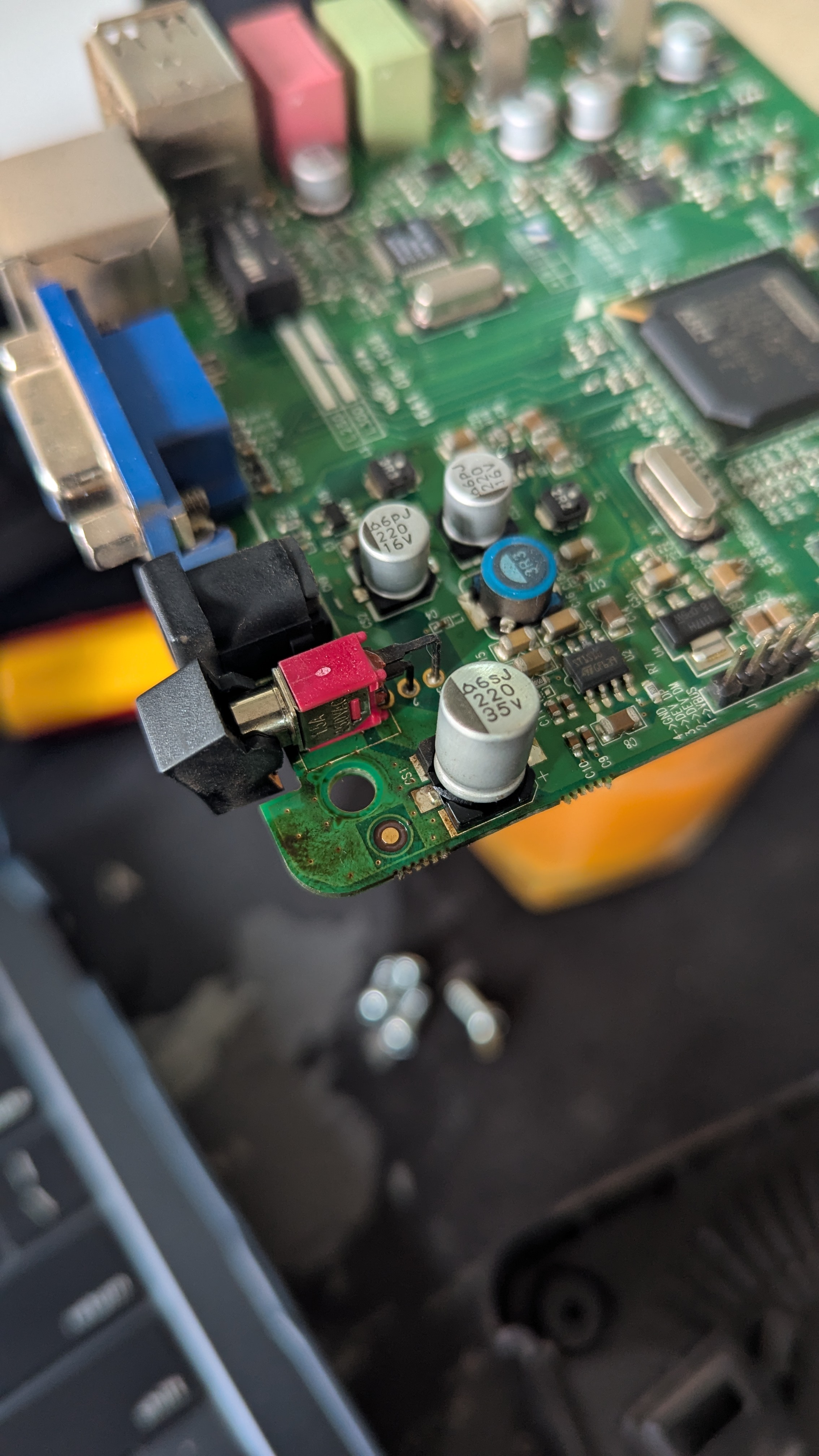 Alternative Text: A close-up image of a green printed circuit board featuring various electronic components, including capacitors, resistors, and connectors. Some of the components are labeled with values. In the background, there are blurred out tools and screws, suggesting a workspace environment focused on electronics repair or assembly.
