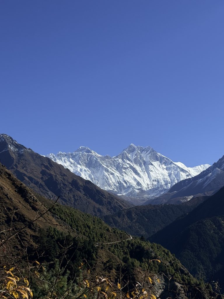 Alternative Text: A panoramic view of majestic snow-capped mountains under a clear blue sky, surrounded by rugged terrain and lush green hills in the foreground.