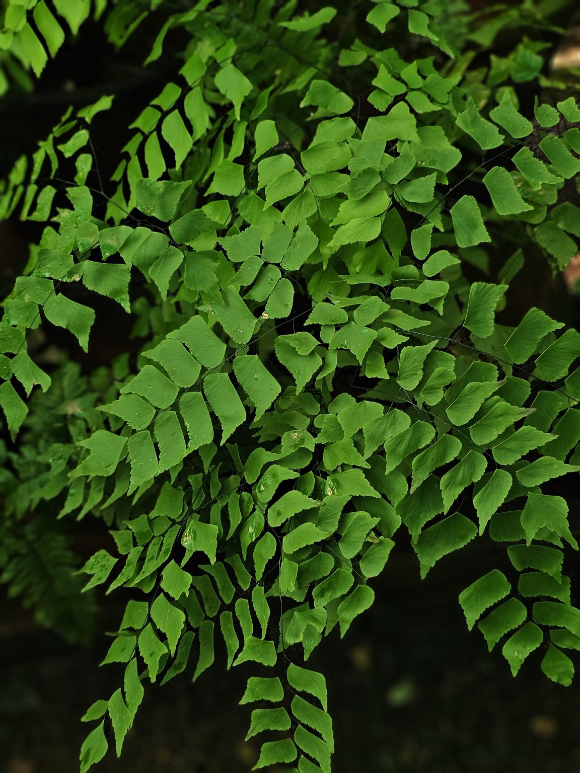Alternative Text: Bright green leaves of a maidenhair fern captured at the Malabar Botanical Garden, Kozhikode. The delicate leaf pattern and gentle light make this simple forest plant look fresh and full of life in its natural setting.
