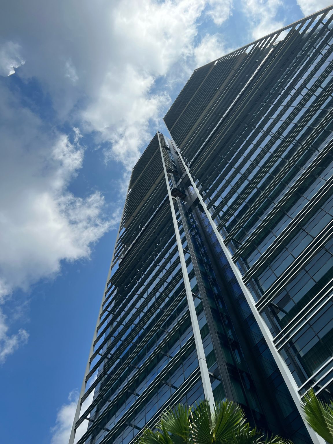 Alternative Text: A low-angle view of two modern skyscrapers with glass facades, reaching up into a blue sky with white clouds.