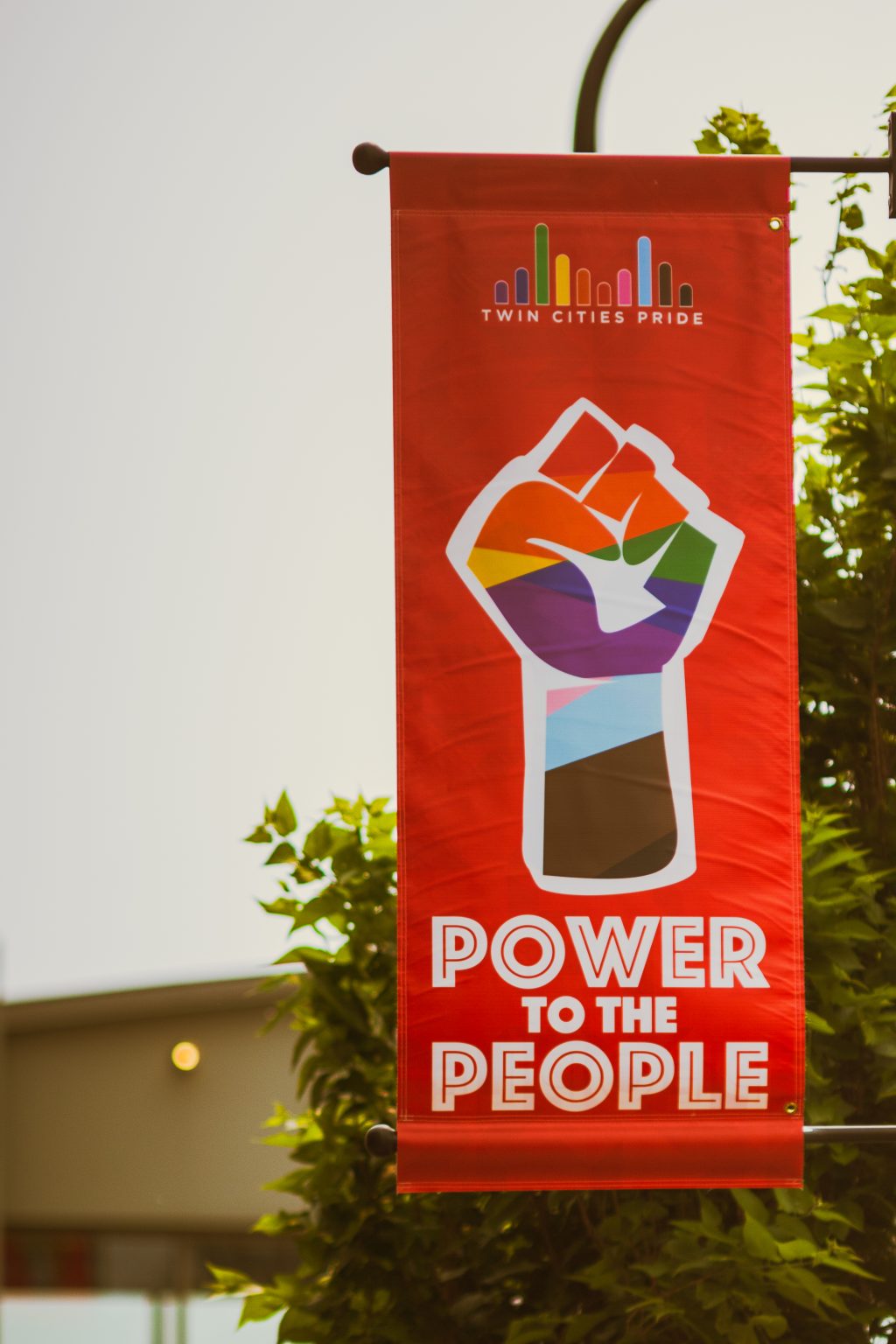 Alternative Text: A red banner reads “Twin Cities Pride” at the top with a rainbow bridge logo and a rainbow fist in the center and the text “Power to the People” at the bottom. In the background is a part of a tree and a low building.