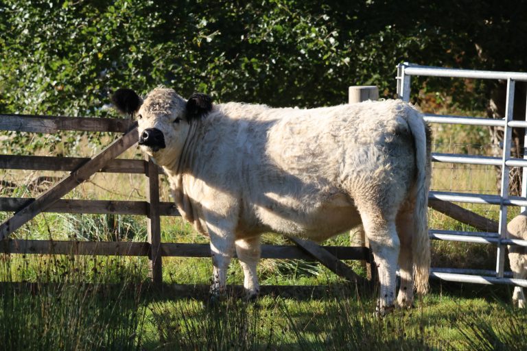Alternative Text: White Galloway cow standing in a field of grass directly in front of a wooden five bar gate.