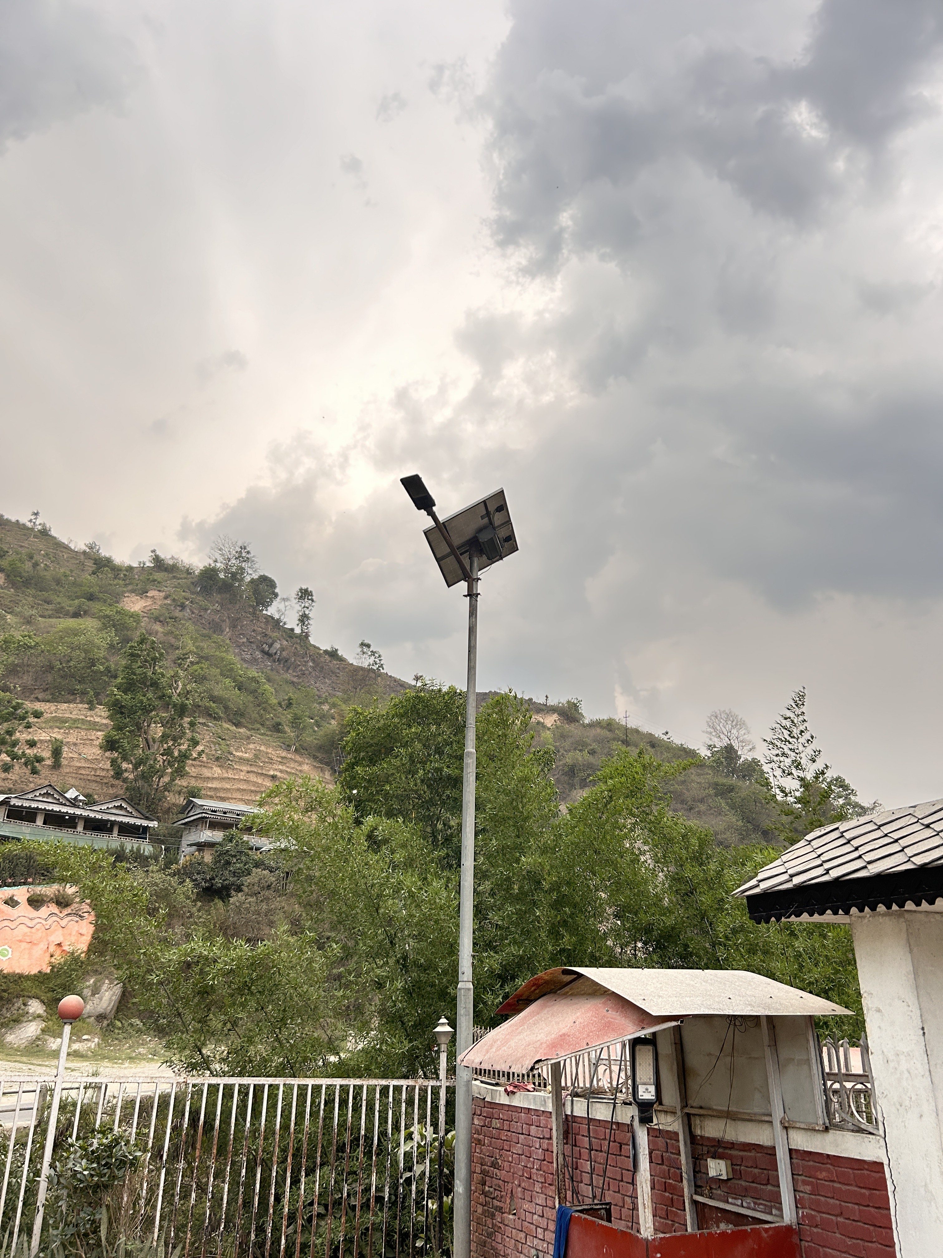 Alternative Text: A tall solar panel mounted on a pole stands prominently against a backdrop of cloudy skies and a hilly landscape.