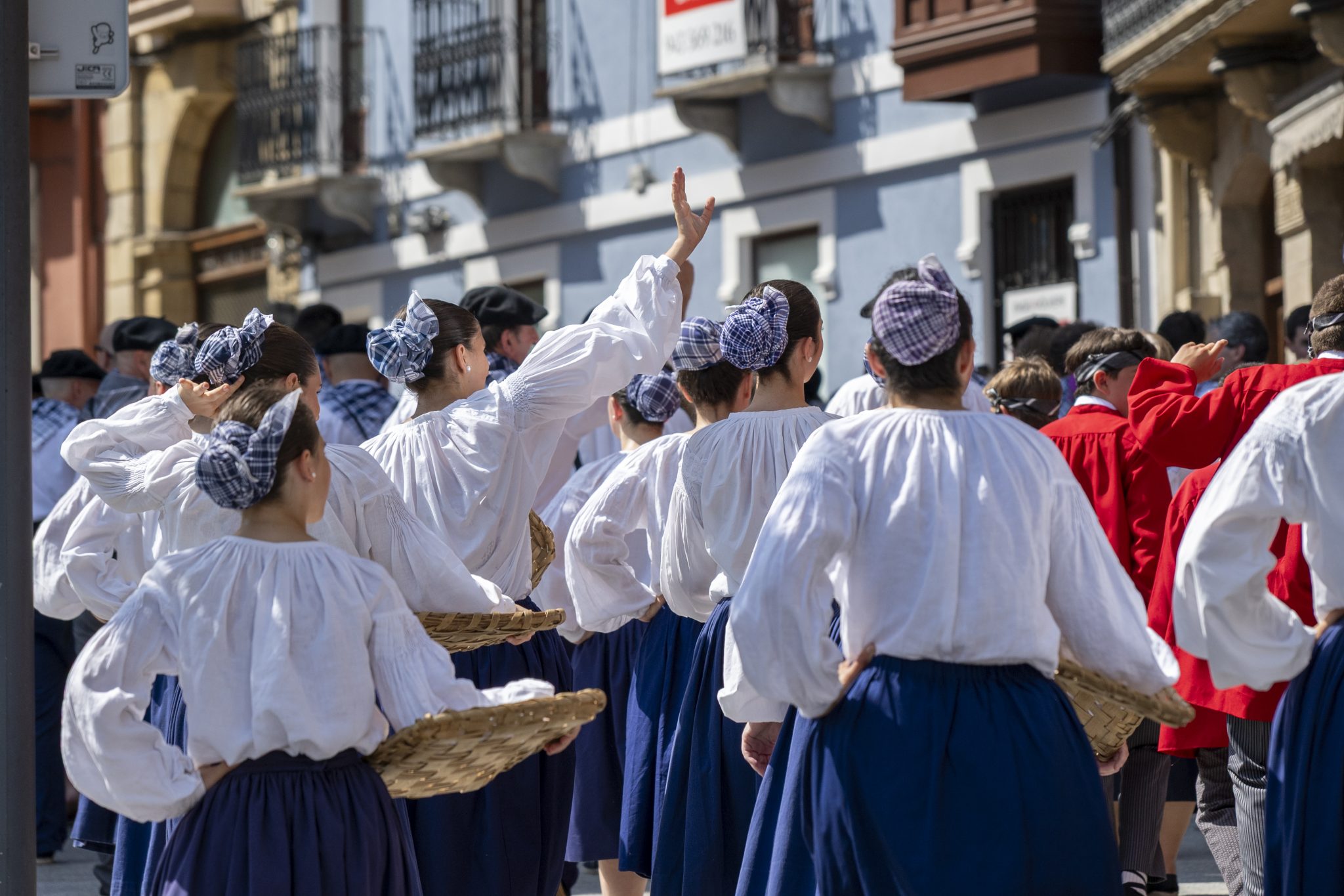 Alternative Text: Group of women in traditional Basque fisherwoman attire take part in the Basque festival parade in Irun, Spain. They wear white blouses, dark blue skirts, and blue-and-white checkered headscarves, carrying trays for fish. One of the women waves to the crowd.
