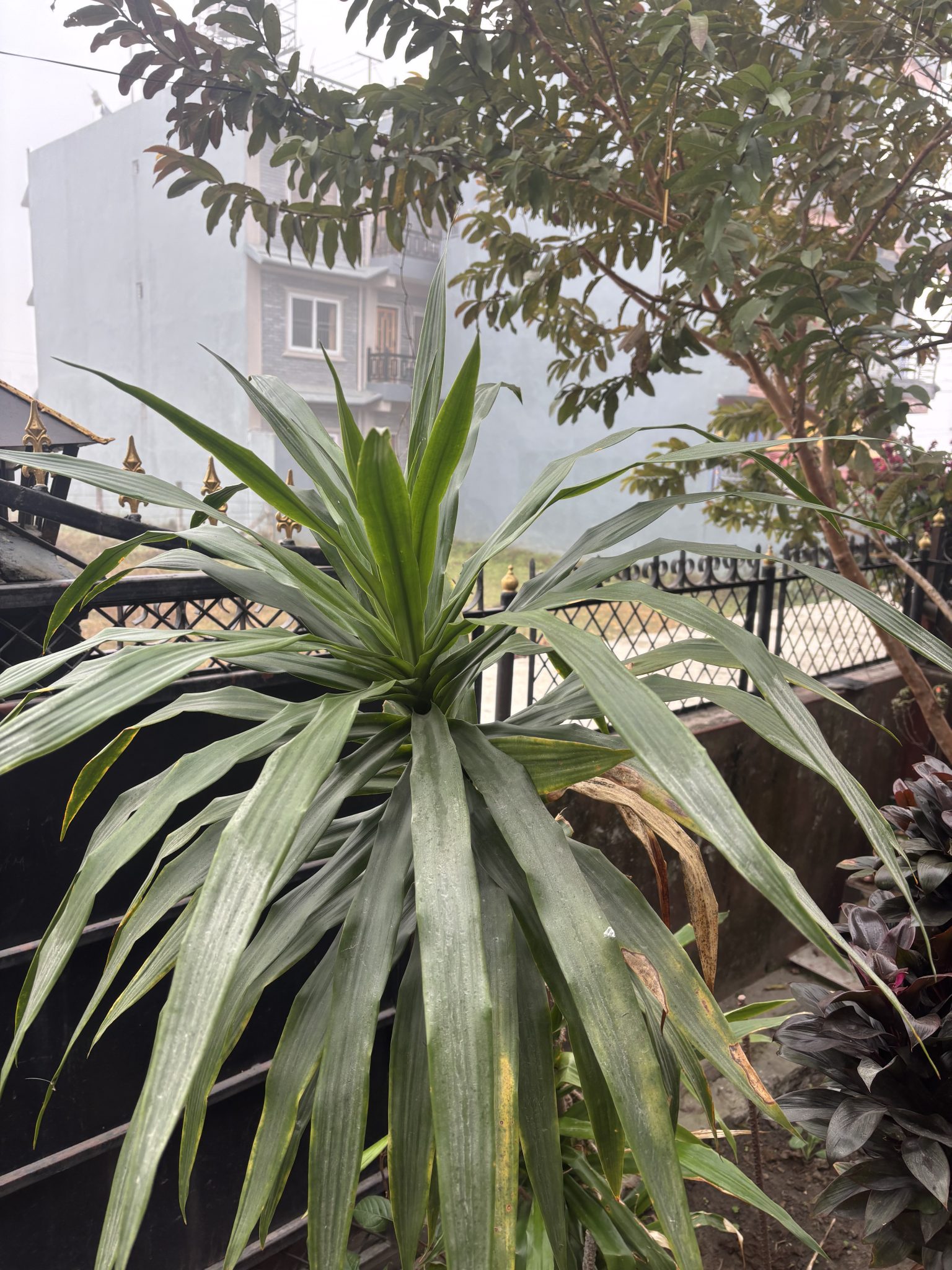 Alternative Text: A close-up view of a green plant with long, narrow leaves in a garden, with a blurry background featuring a building partially obscured by mist.