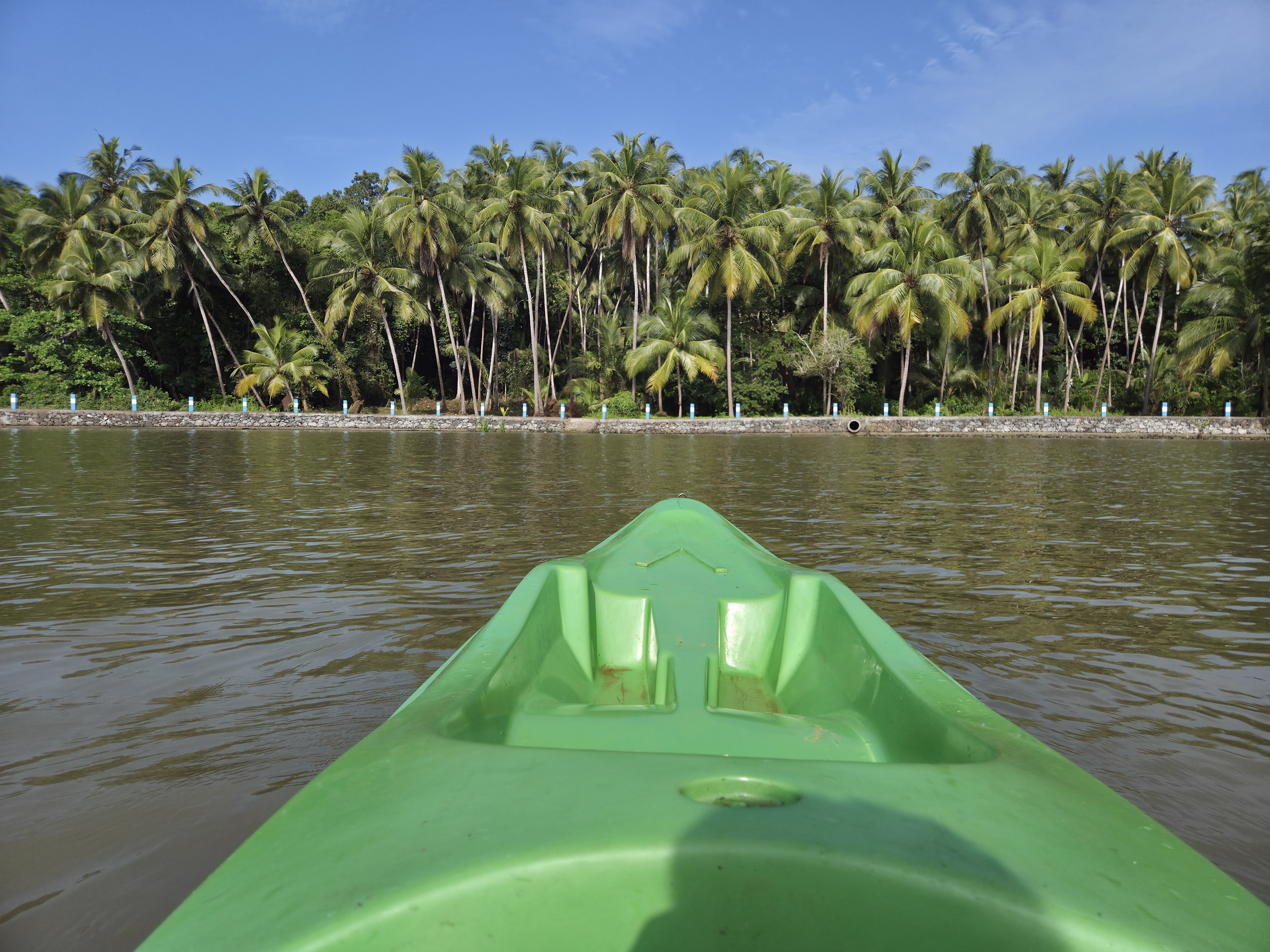 Alternative Text: A green kayak faces calm water, with palm trees and a stone wall along the shore.