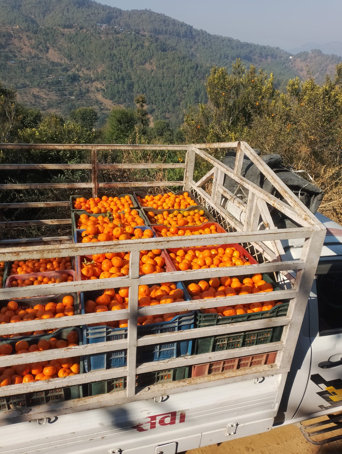 Alternative Text: A truck loaded with crates of bright orange citrus fruits is parked on a hillside, surrounded by lush green trees and rolling mountains in the background.