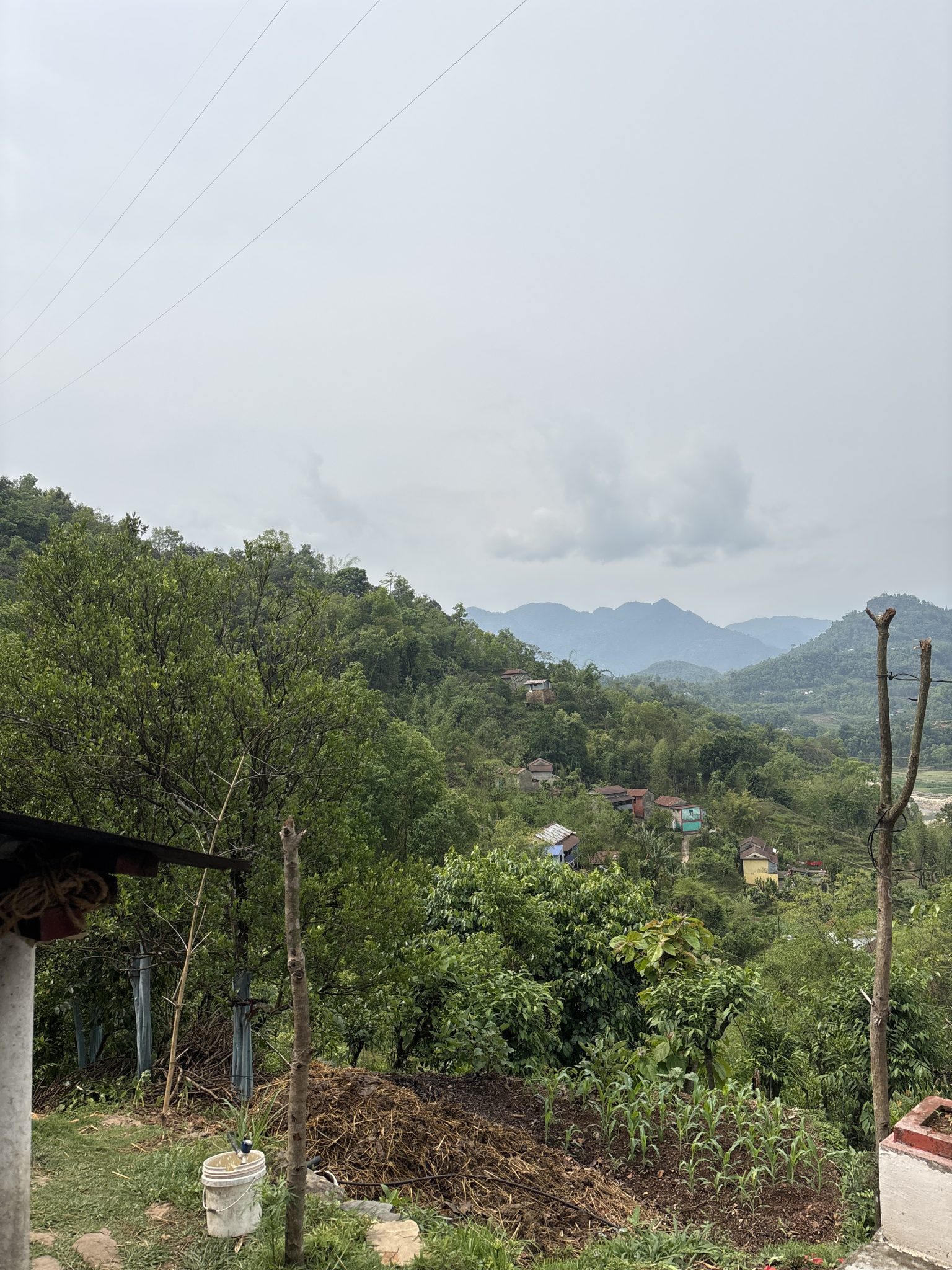 Alternative Text: A rural landscape featuring rolling hills and mountains in the distance under a cloudy sky.