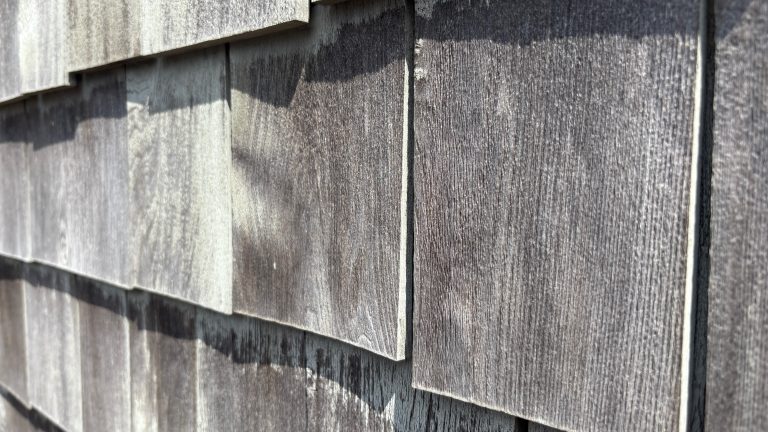 Alternative Text: A closeup of weathered old wooden shingles used as siding on a building.