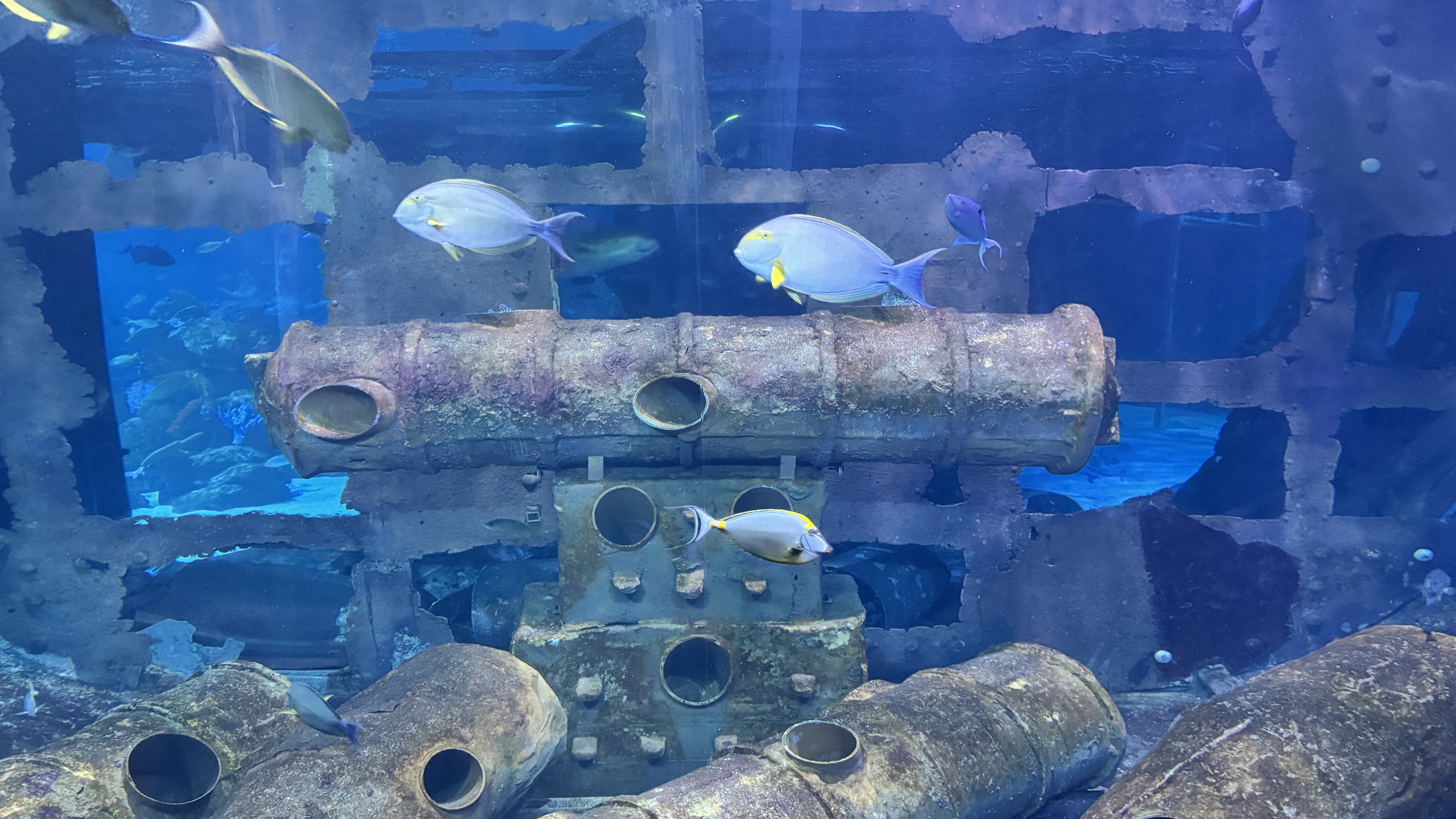 Alternative Text: Several blue and yellow tropical fish swim around large, rusted underwater cannons and wreckage in a clear blue tank.