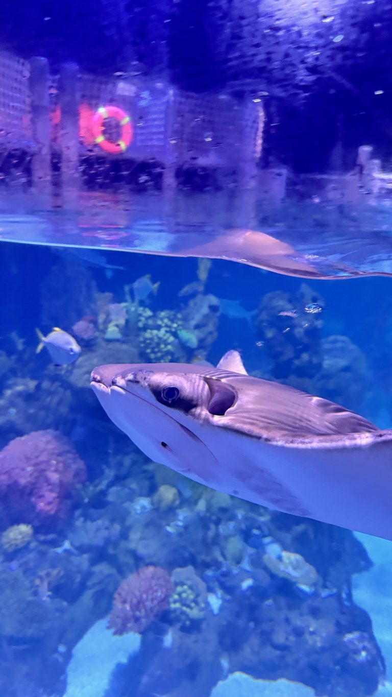 Alternative Text: A close-up, low-angle view of a grey stingray swimming near the water’s surface in a large blue aquarium tank.