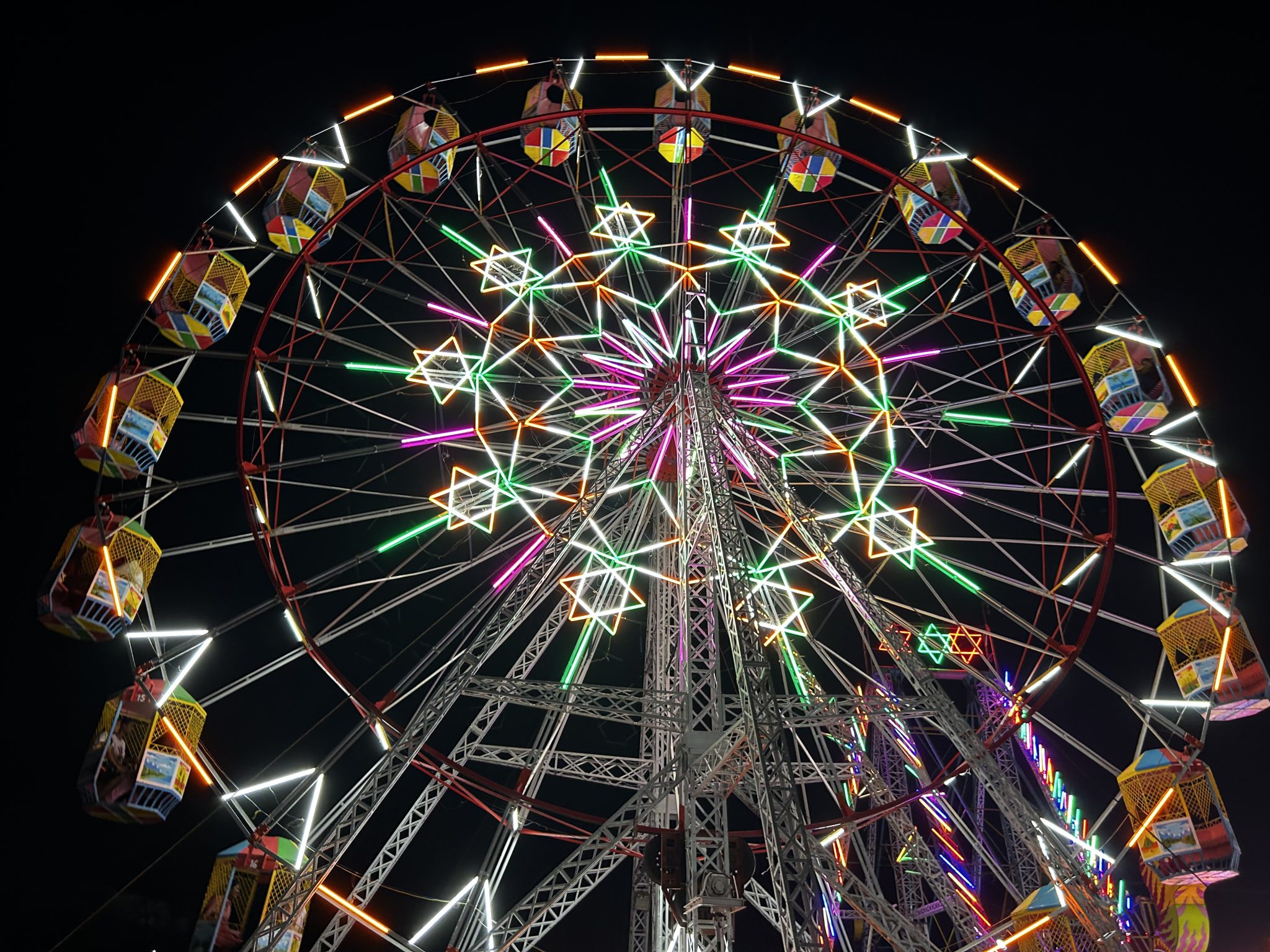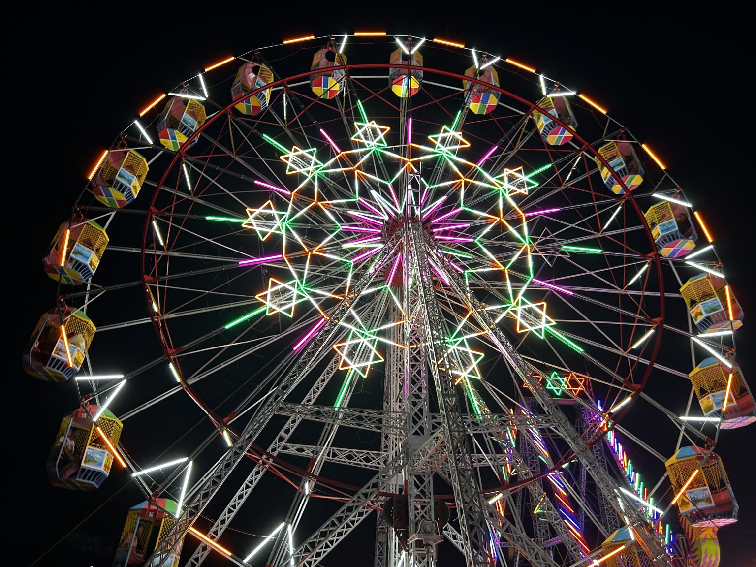 Alternative Text: A brightly lit Ferris wheel at night with colorful neon lights in star shapes and multicolored passenger cabins.