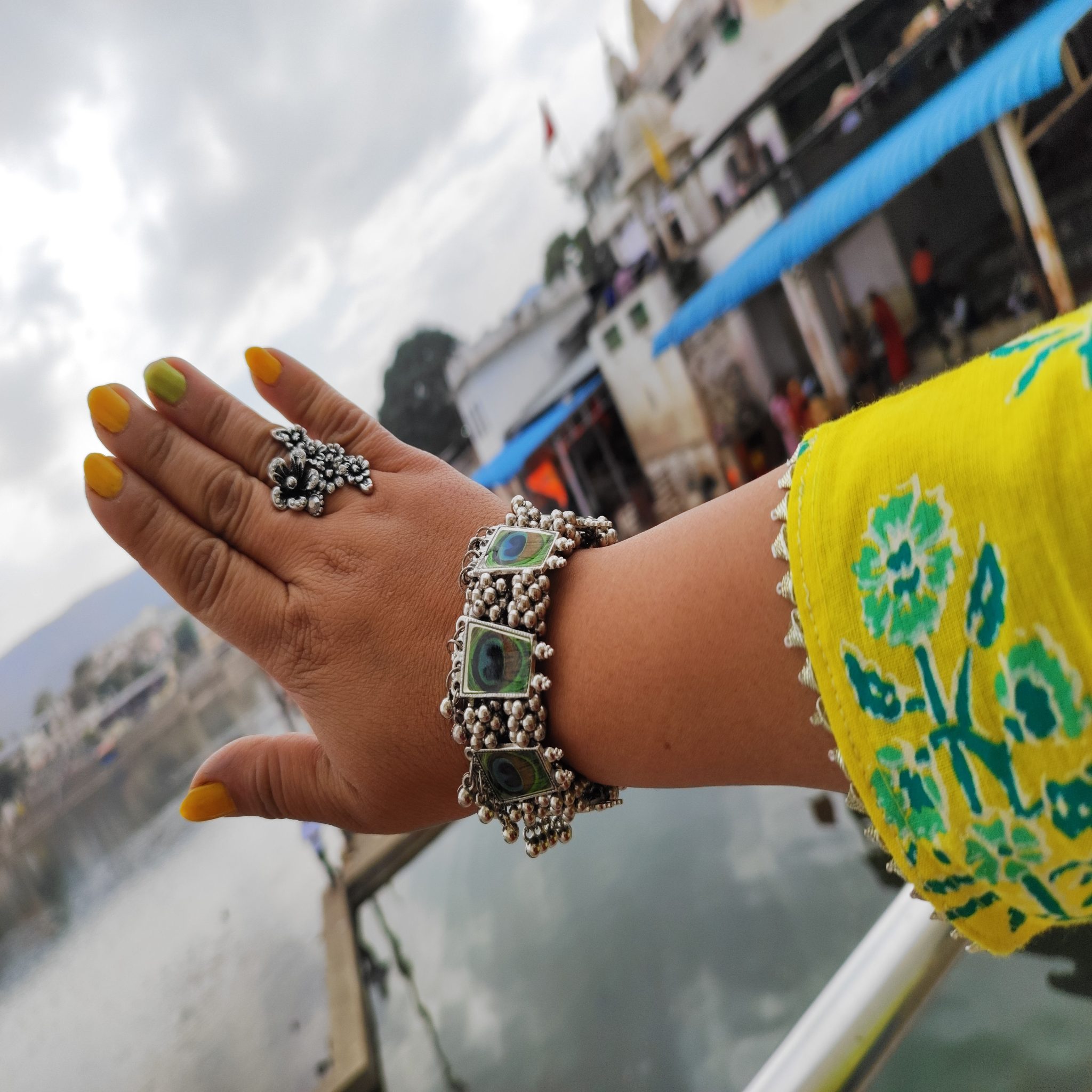 Alternative Text: A woman’s hand adorned with a yellow manicure and a bracelet, showcasing the elegance of peacock jewelry.