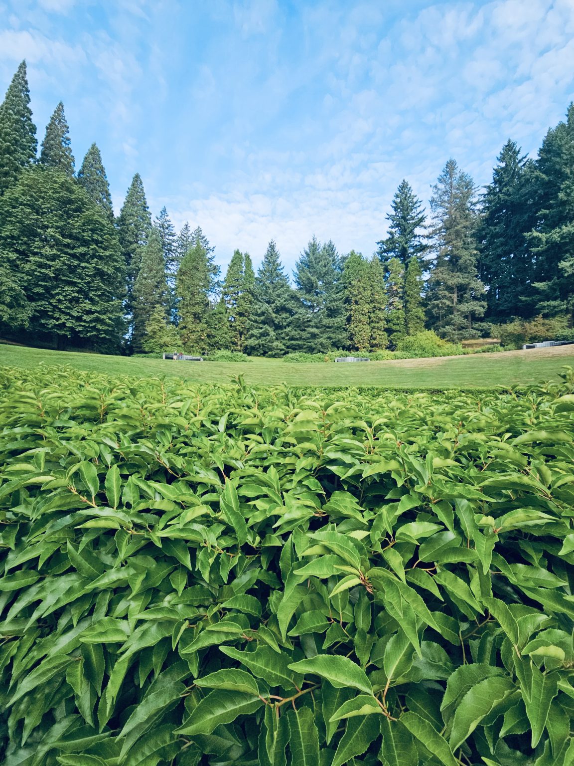 Alternative Text: A dense, vibrant green hedge, likely Portuguese laurel, featuring polished dark green leaves and reddish stems, set against a blurred grassy background. Captured from Washington Park, Portland.