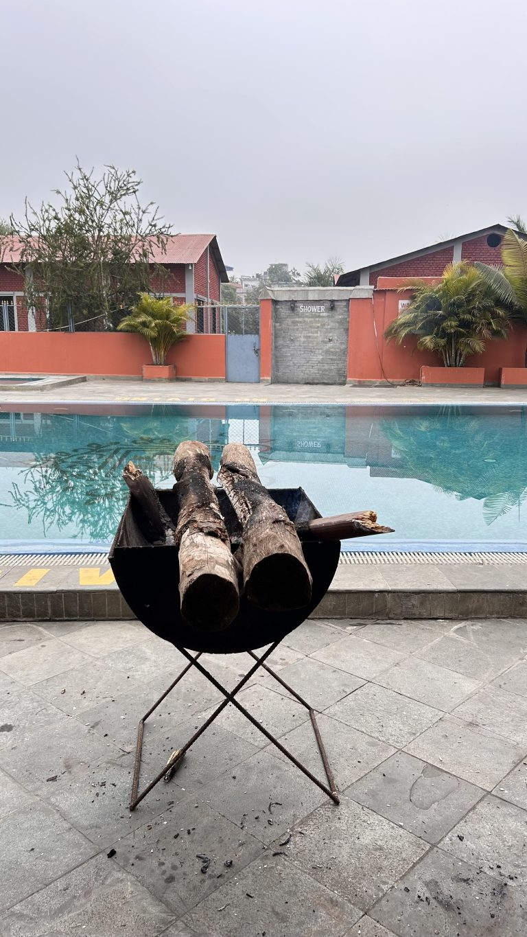 Alternative Text: A black fire pit with several logs of wood placed on top sits on a tiled surface near a blue swimming pool.