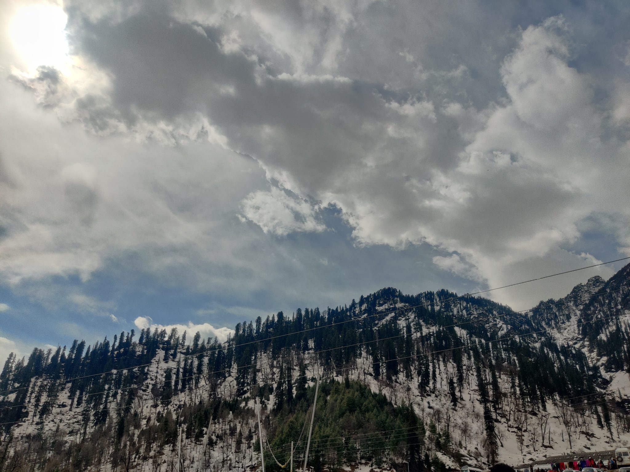 Alternative Text: A scenic view of Solang Valley in Manali, India with coniferous trees under a partly cloudy sky, power lines stretching across the foreground.