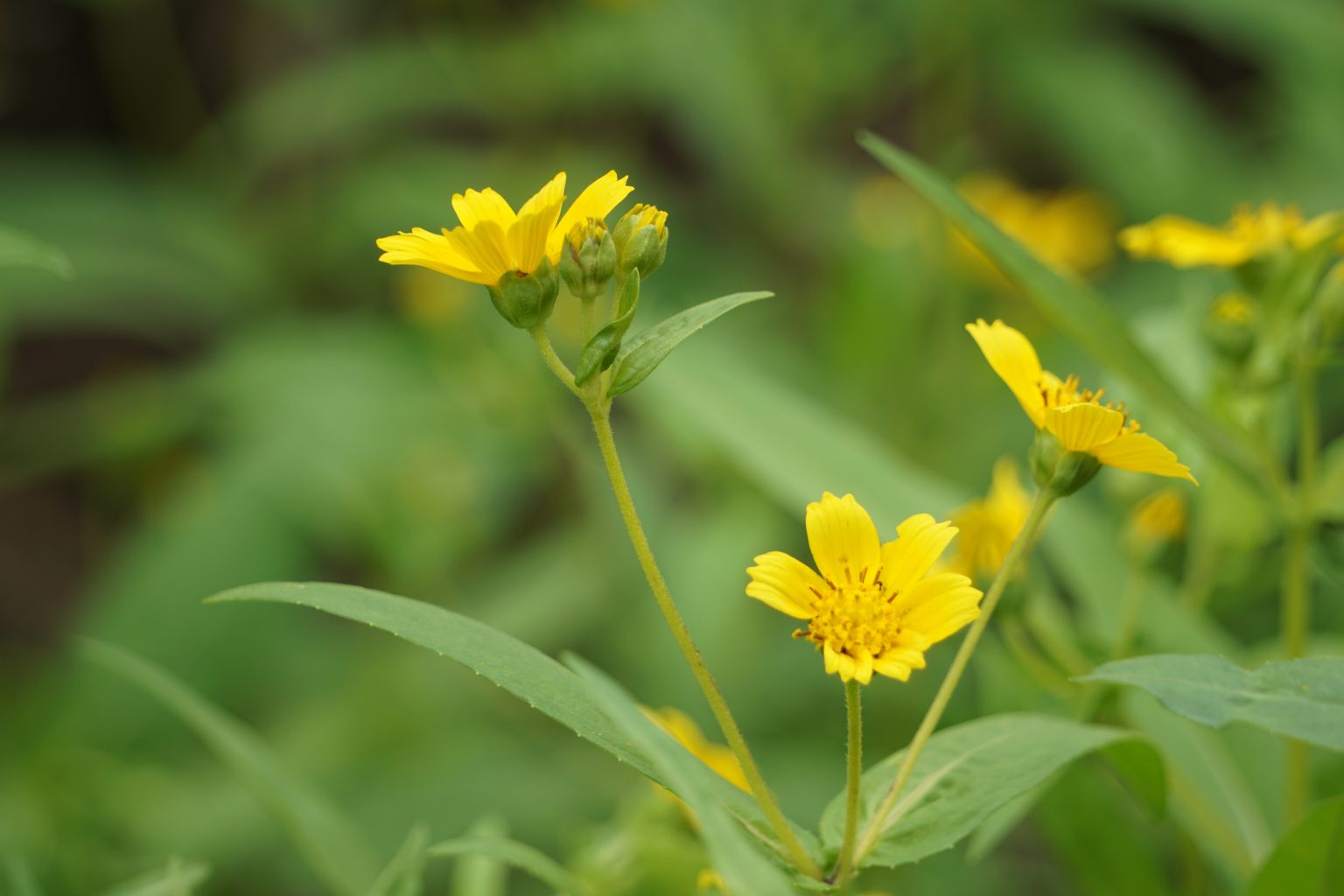 Alternative Text: A close-up of yellow wildflowers surrounded by green foliage.