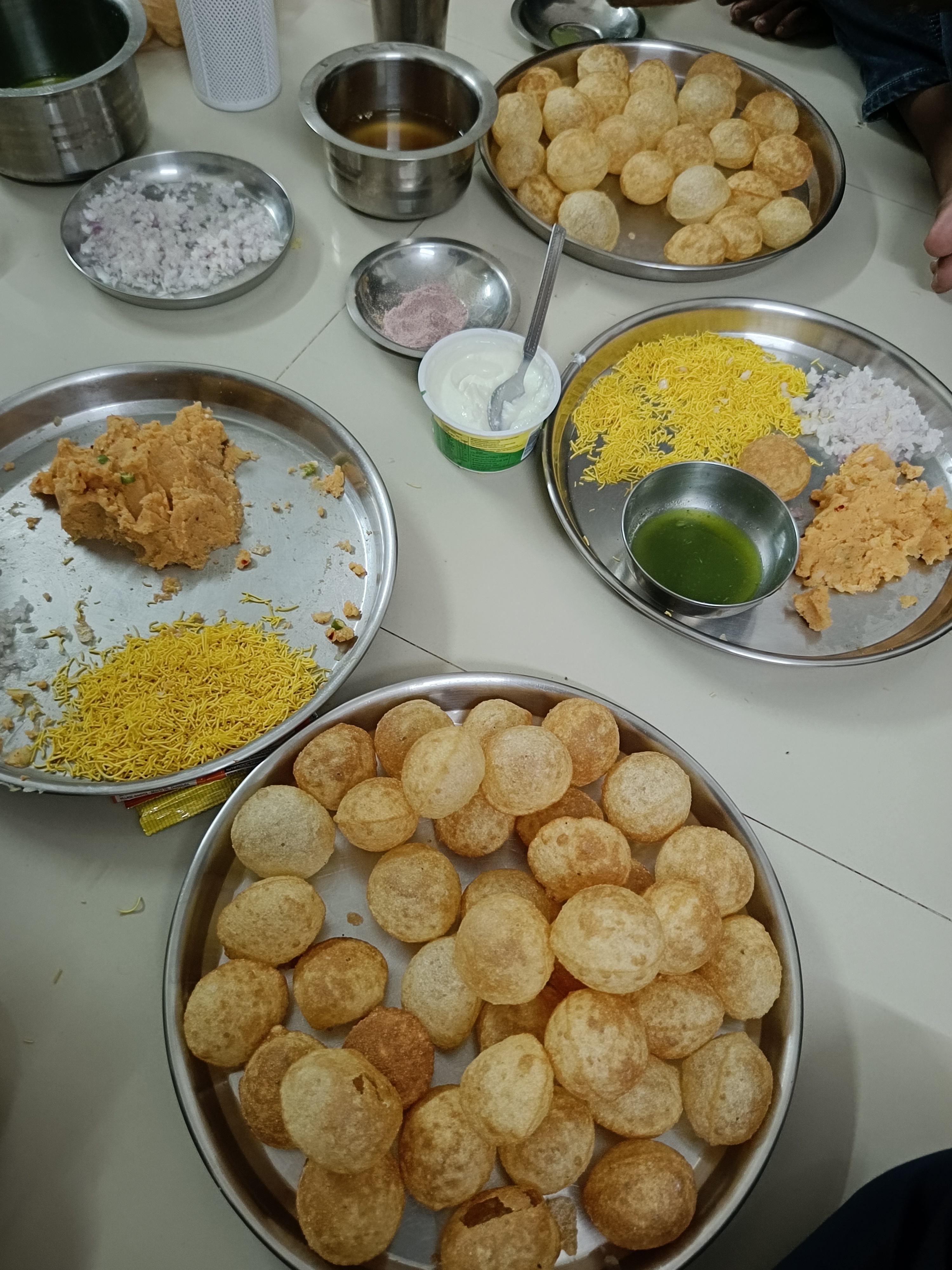 Alternative Text: A casual spread of snacks features crispy puris, creamy yogurt, sev, chutneys, and spiced broth arranged on metal plates.