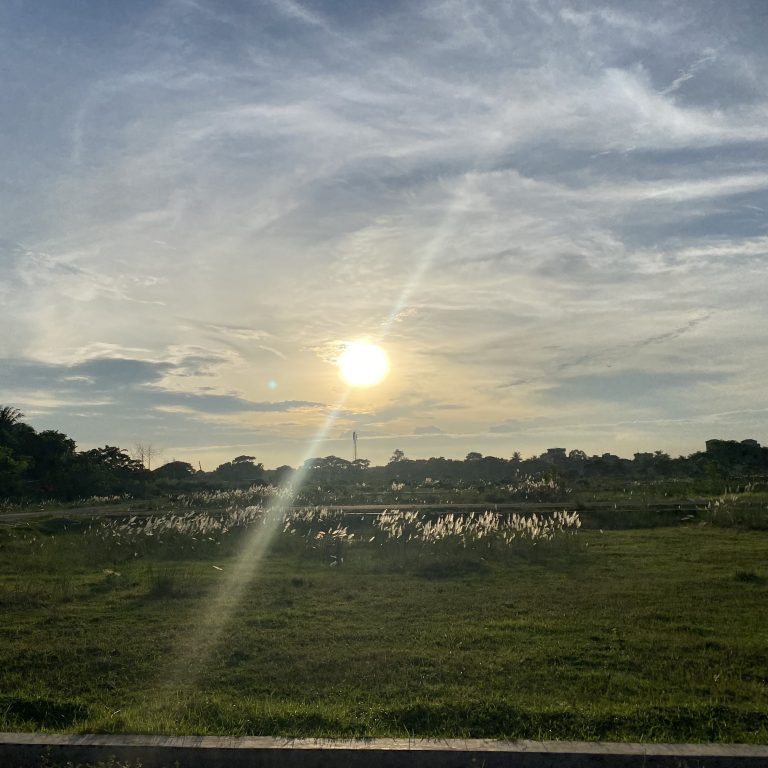 Alternative Text: A scenic view of a landscape at sunset, featuring a bright sun low on the horizon surrounded by soft clouds in a blue sky