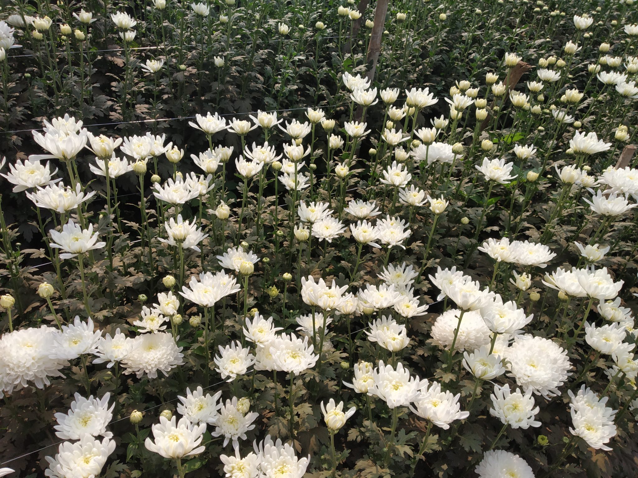 Alternative Text: Close-up of blooming white chrysanthemums in a lush garden