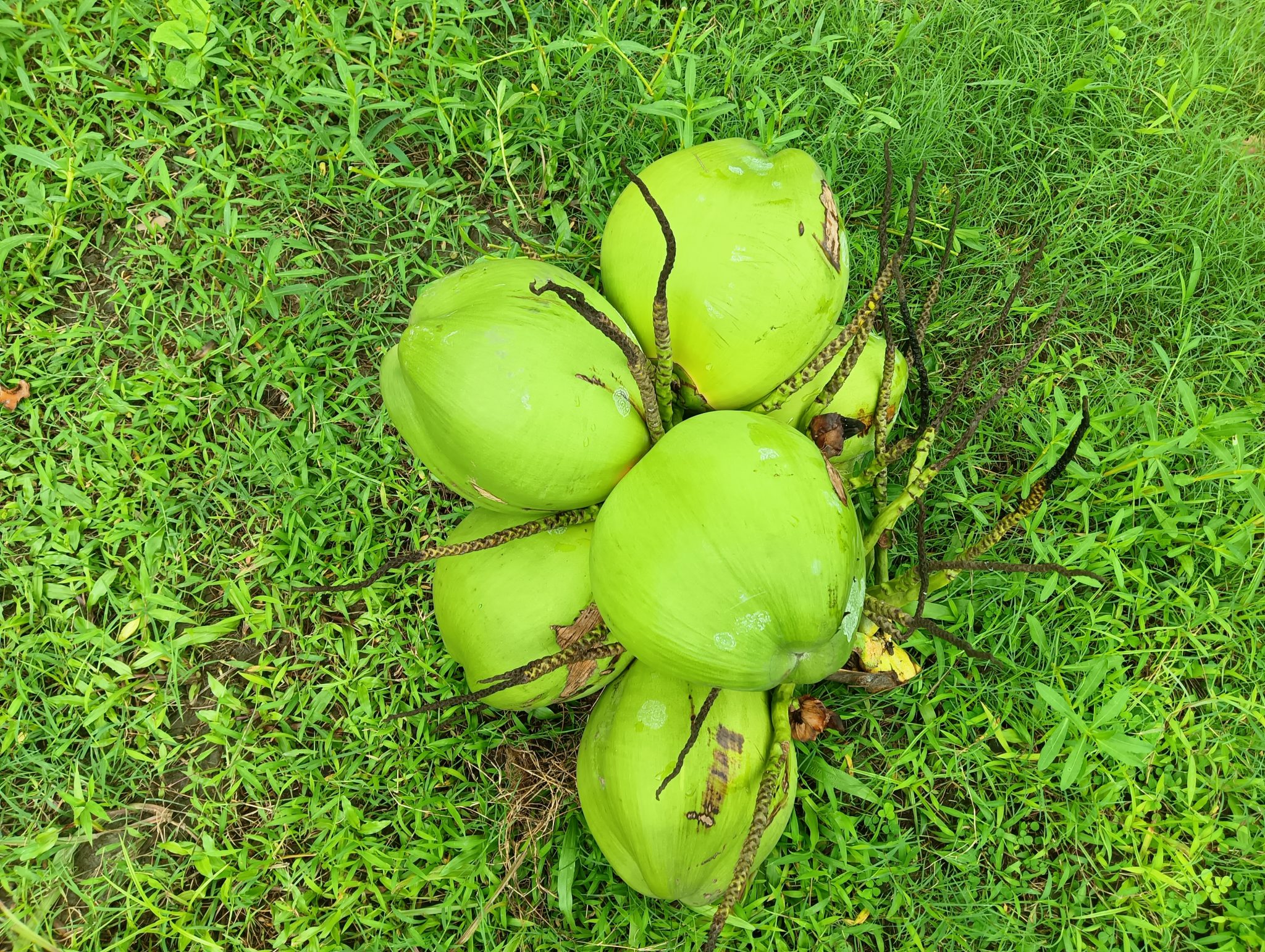Alternative Text: A cluster of fresh green coconuts resting on a bed of lush green grass.