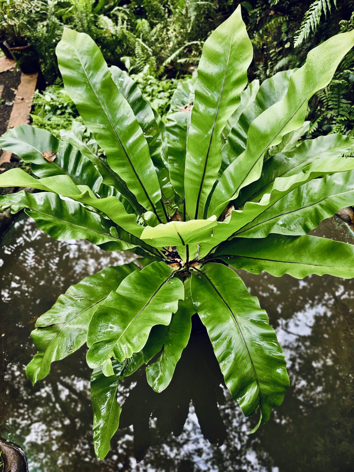 Alternative Text: A fresh bird’s nest fern spreading broad, glossy green leaves above a quiet water body at the Malabar Botanical Garden, Kozhikode, Kerala. The reflection and symmetry highlight the peaceful beauty of this tropical fern habitat.