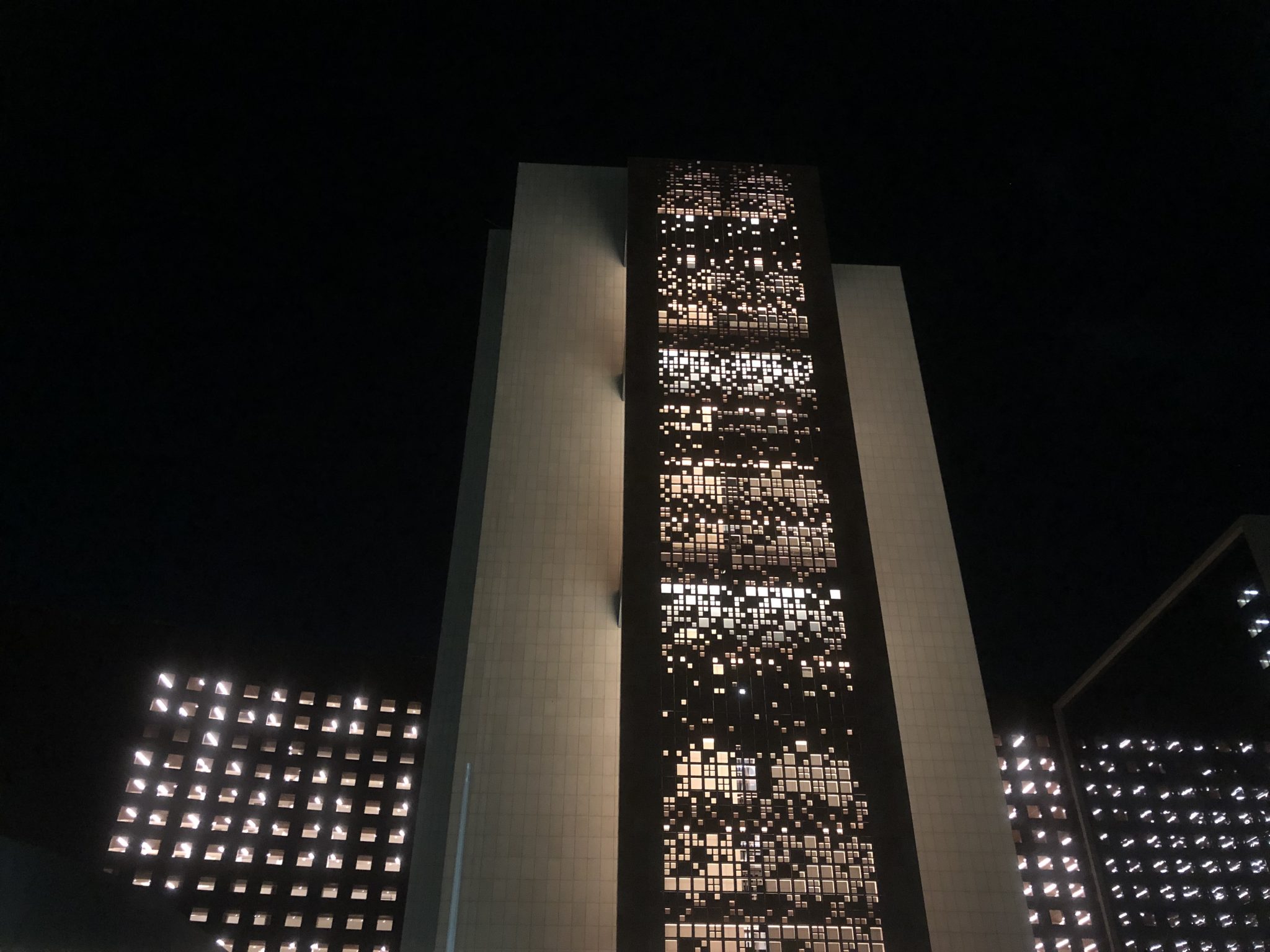 Alternative Text: In the heart of Surat, under the velvet shroud of night, the Surat Diamond Bourse comes alive as a luminous jewel in the urban landscape. Bathed in the soft, azure glow of the city’s night lights, this architectural marvel stands as a testament to the city’s glittering diamond industry. The facade of the bourse is adorned with a constellation of ti