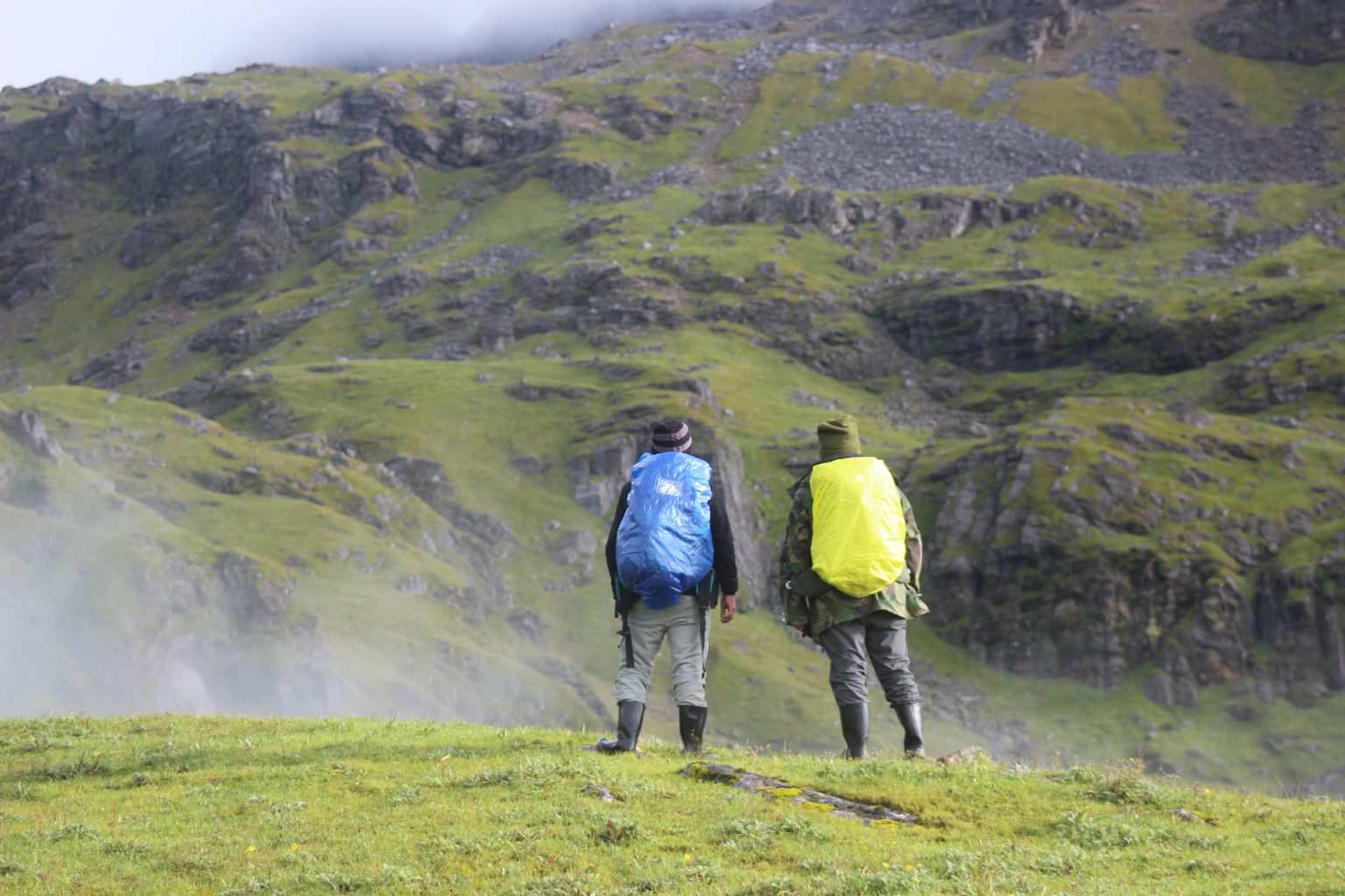 Alternative Text: Two hikers wearing backpacks, one covered with a blue rain cover and the other with a yellow cover, stand on a grassy hillside looking towards a mountainous landscape with rocky terrain and patches of green vegetation.
