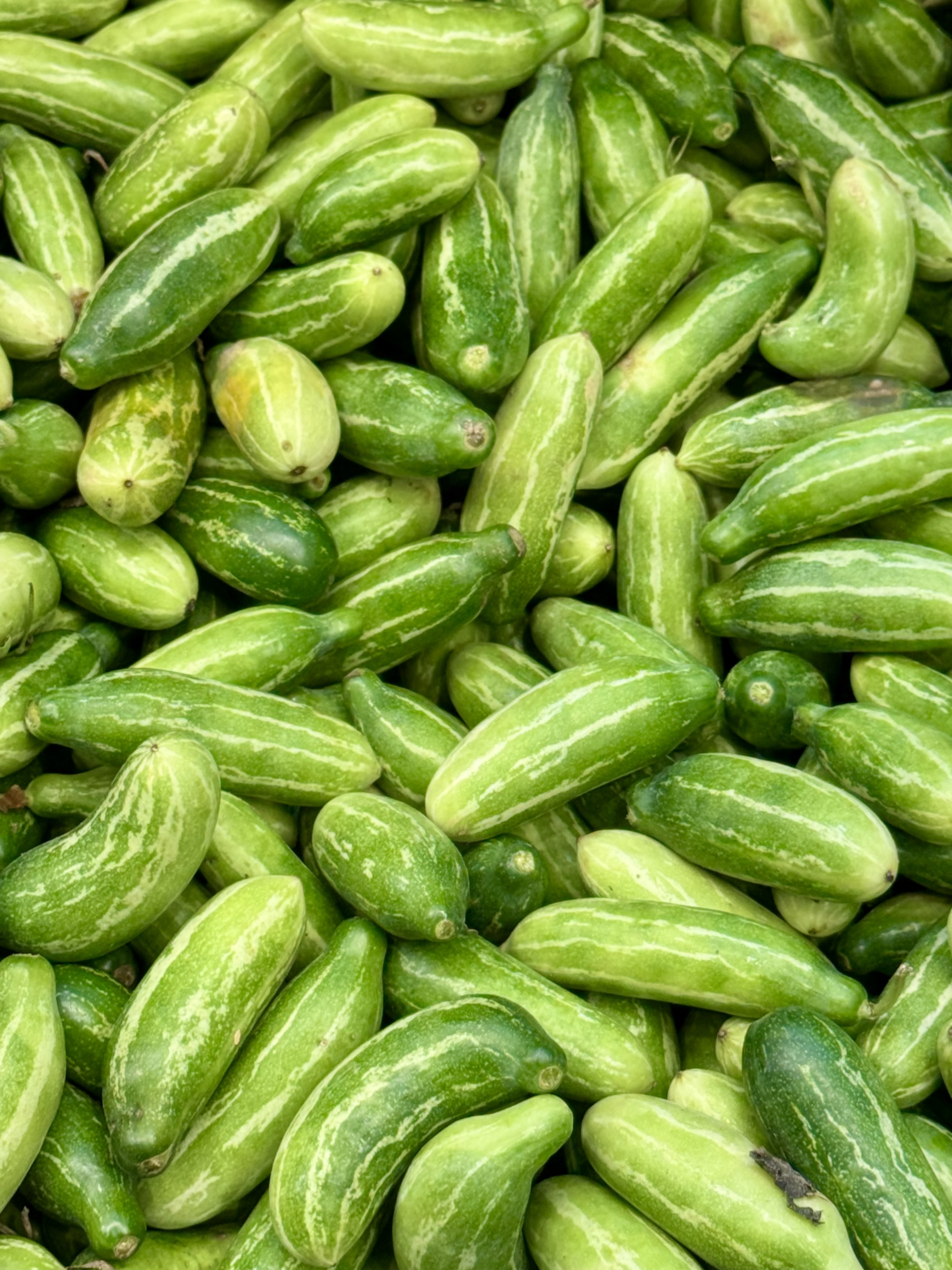 Alternative Text: A close-up of a large pile of green Ivy Gourd (Koala) in different sizes and shapes, some with light stripes, stacked together with a fresh natural sheen.