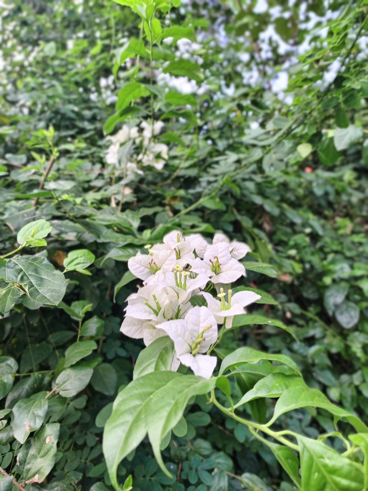 Alternative Text: A cluster of white bougainvillea blooms in sharp focus stands out against lush, sunlit green leaves.