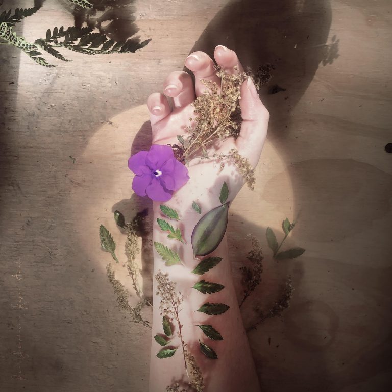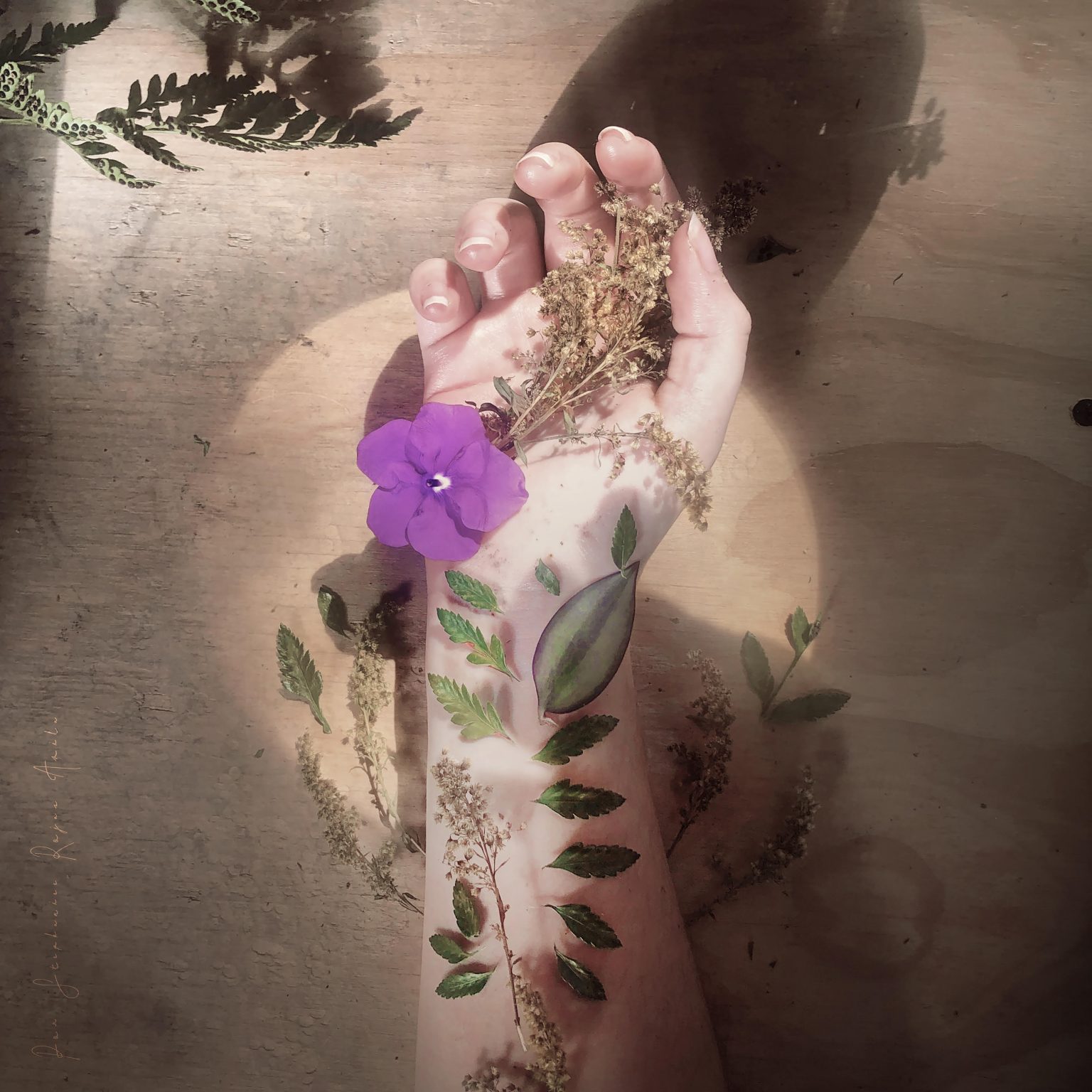 Alternative Text: A hand with flowers in a table with leaves around it simulating an poetic fine art image