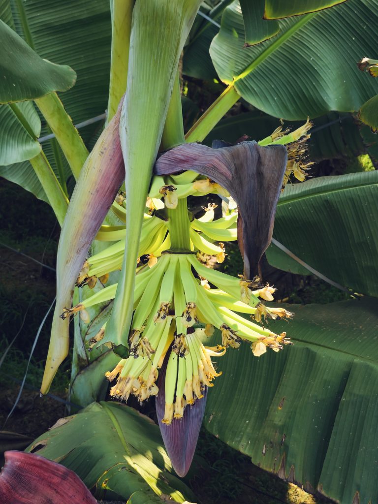 Alternative Text: Fresh green Nendran bananas (Kerala banana or Plantain banana) are forming on a banana plant, surrounded by large leaves and a purple flower bud. A close look at tropical fruit growth captured in Mavoor, Kozhikode, Kerala.