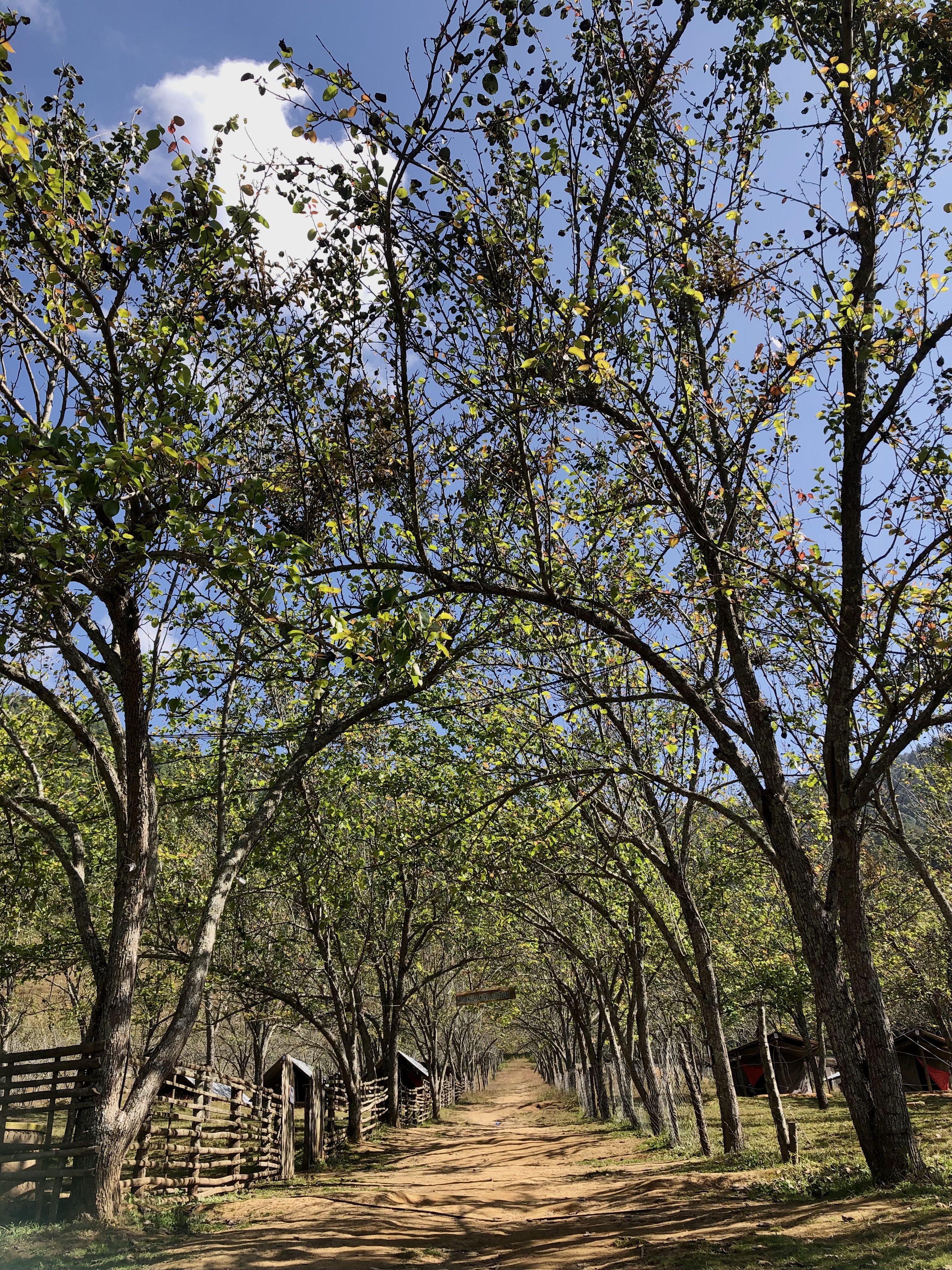 Alternative Text: A dirt path leads through an archway of trees, with branches overhead creating a natural canopy.