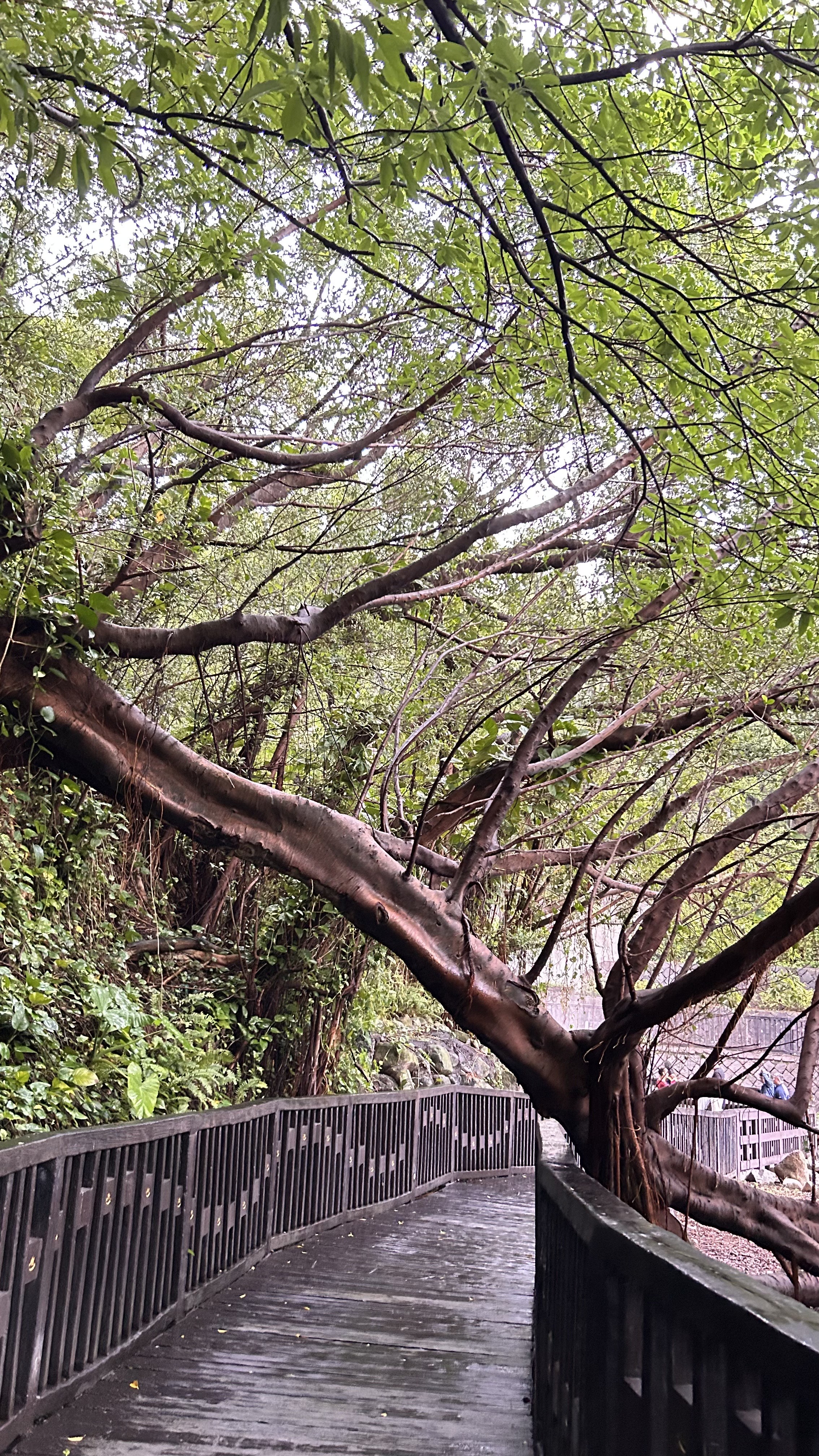 Alternative Text: A wooden walkway curves through a lush, green environment, with large tree branches extending overhead.