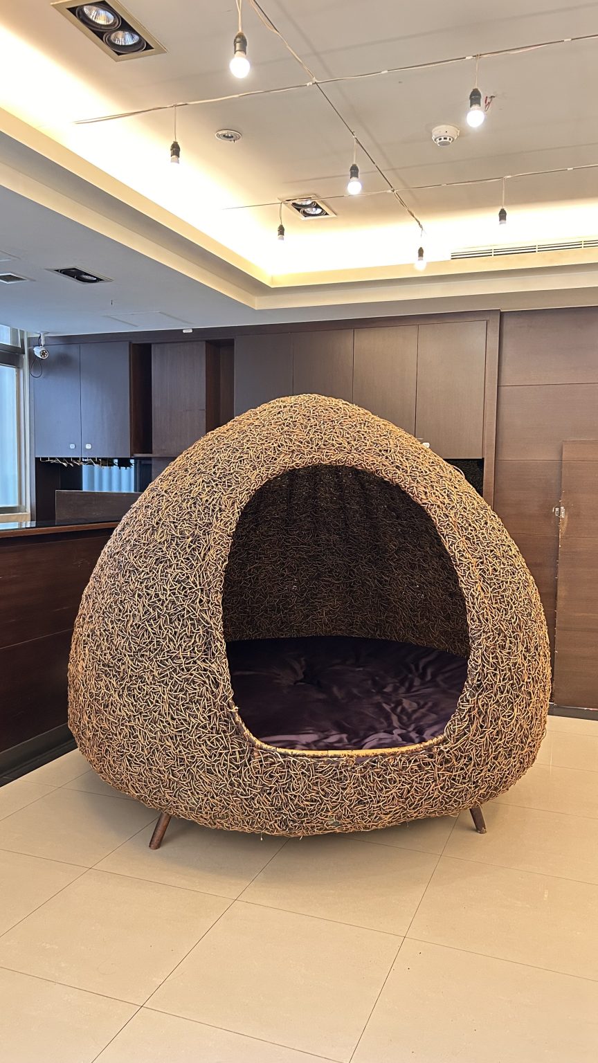 Alternative Text: A large, dome-shaped seating structure made of woven material resembling twigs or vines, featuring a purple cushion inside.