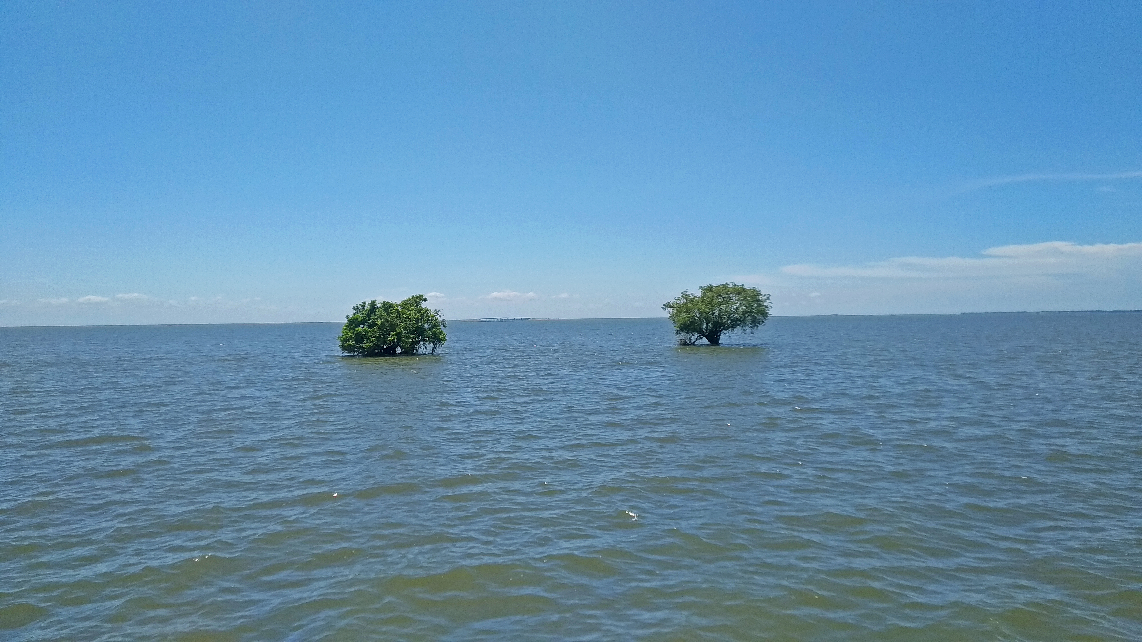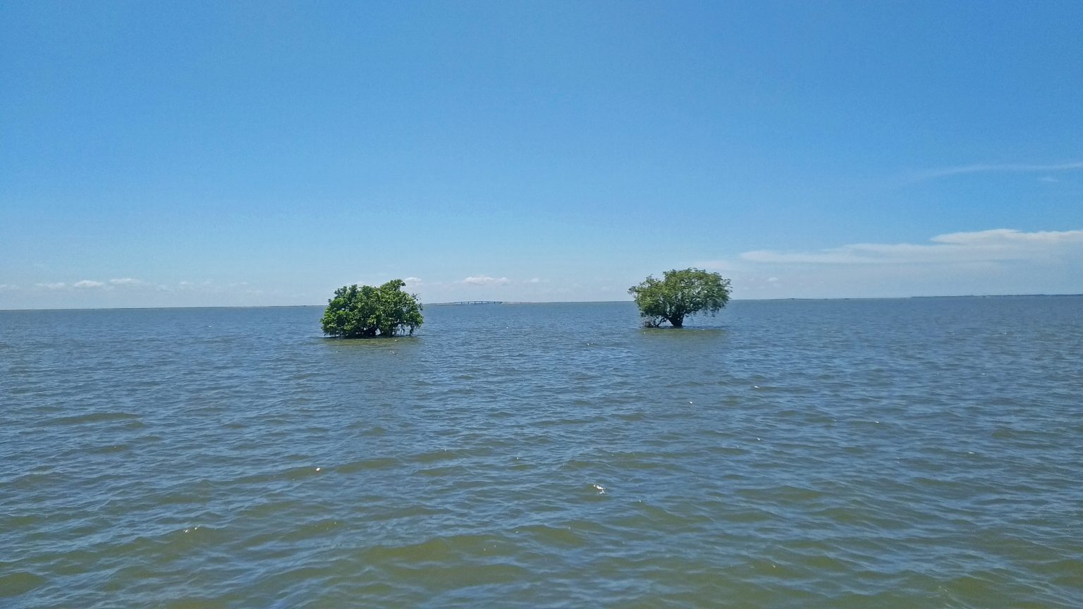 Alternative Text: This image shows a calm body of water under a clear blue sky. Two small, green trees are partially submerged and standing apart in the water. In the distant background, a structure—possibly a bridge—is faintly visible on the horizon. The scene conveys tranquility and isolation, likely captured in a coastal or floodplain area.