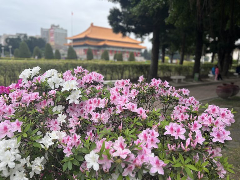 Alternative Text: A close-up shot of a bush with pink and white flowers, with a traditional Chinese-style building in the background