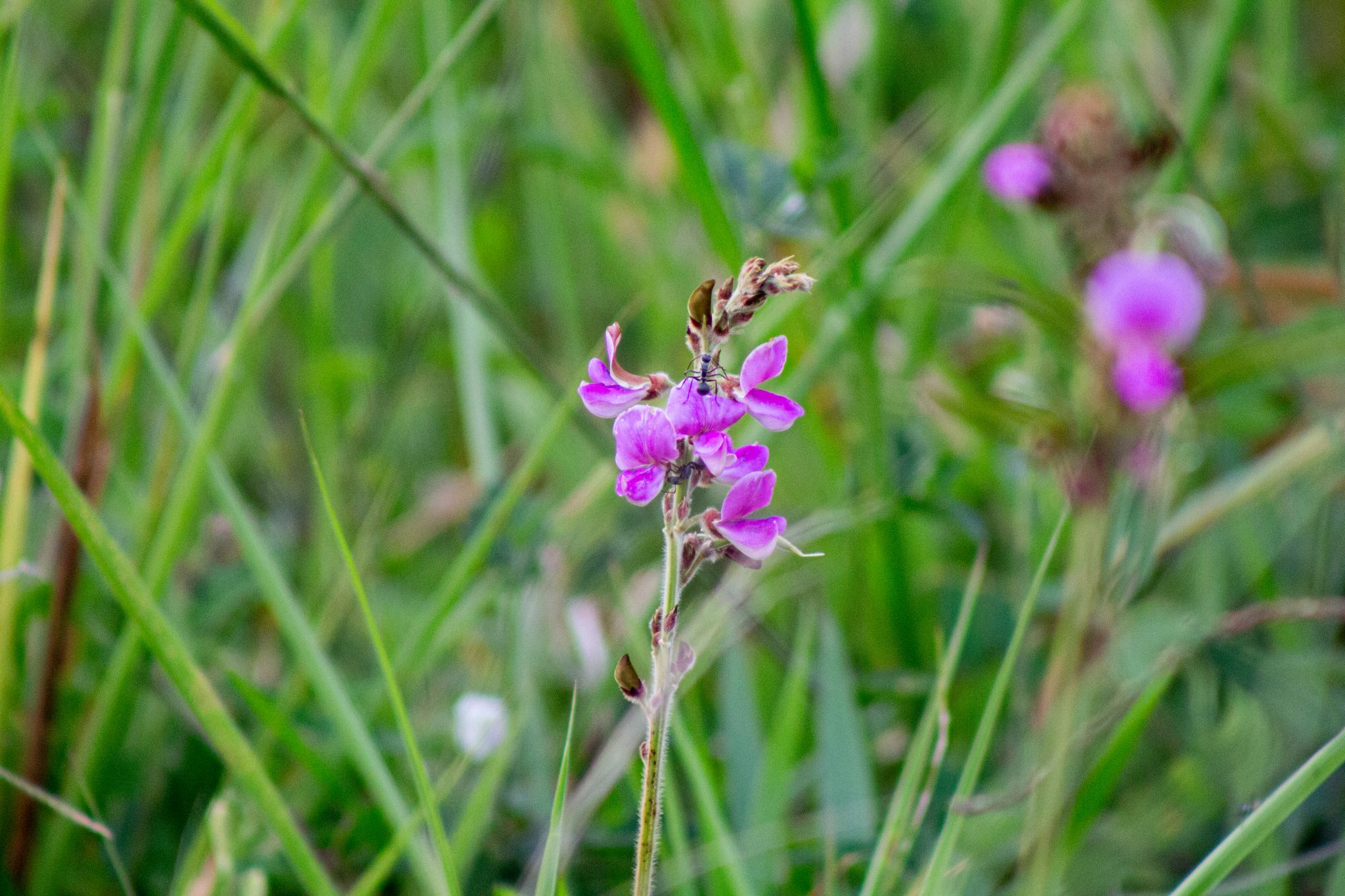 Alternative Text: A single stemmed flower with vibrant purple petals stands out against a blurred background of green grass and foliage.