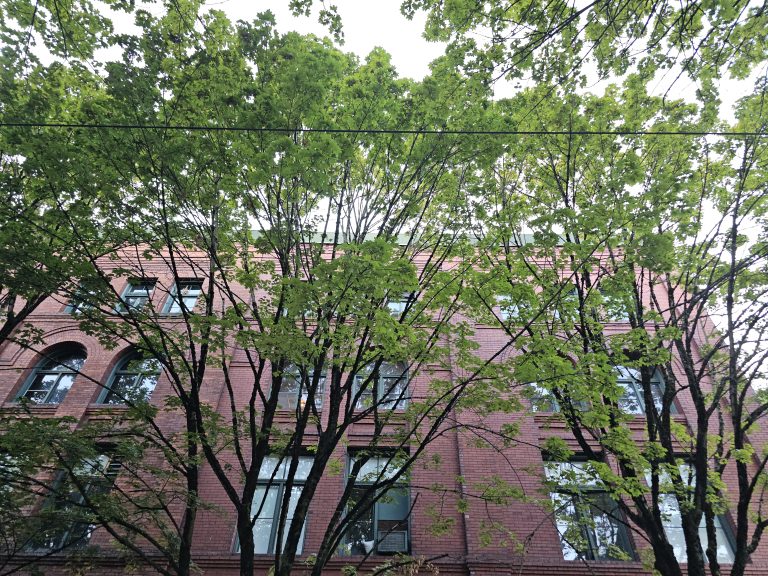 Alternative Text: A red brick building partially hidden behind a row of green trees. The branches and leaves cover the building’s upper windows, an evening shot from downtown Portland.