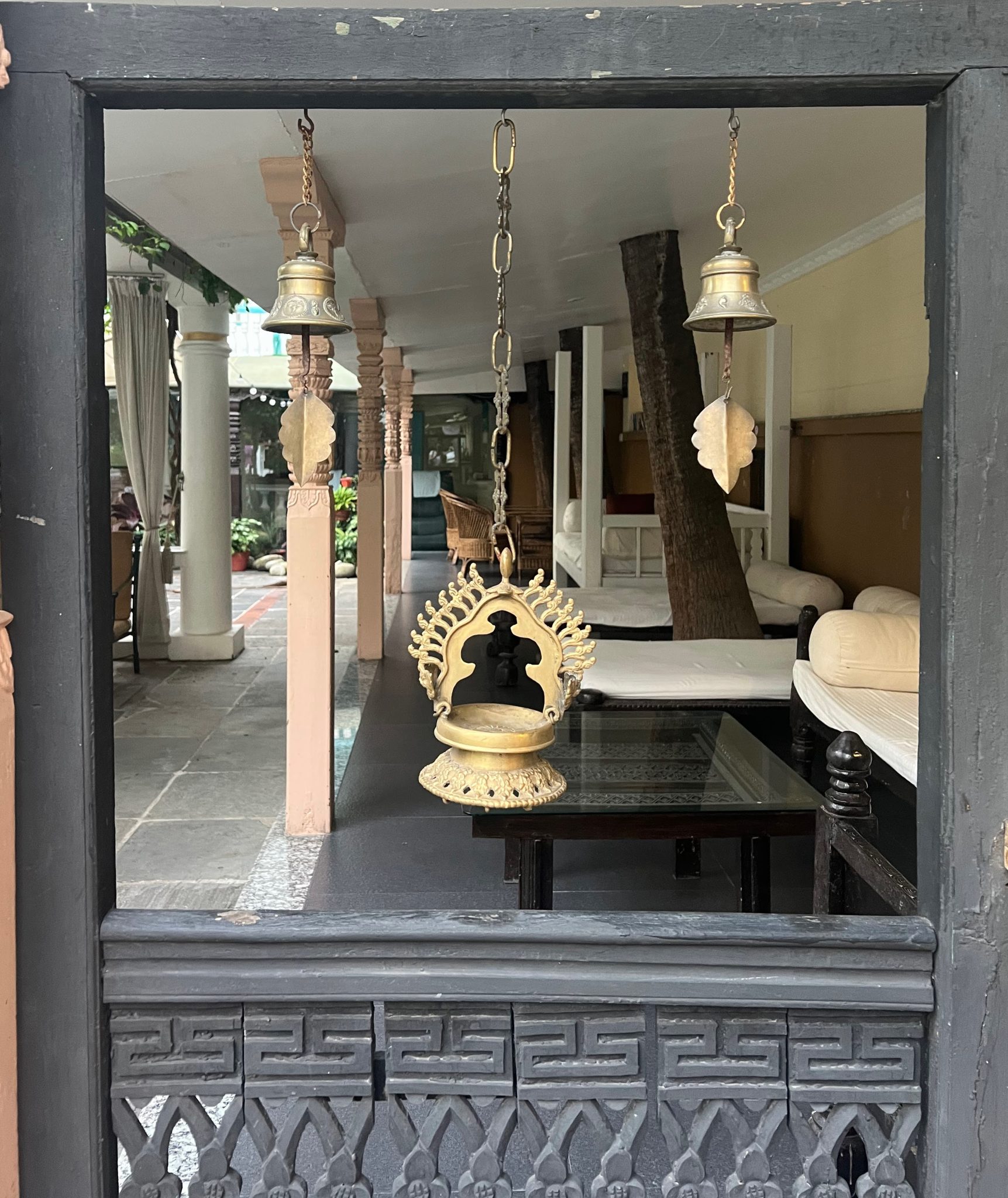 Alternative Text: A carved wooden doorway frames a patio with white seating, brass Dalucha lamps, and hanging bells.