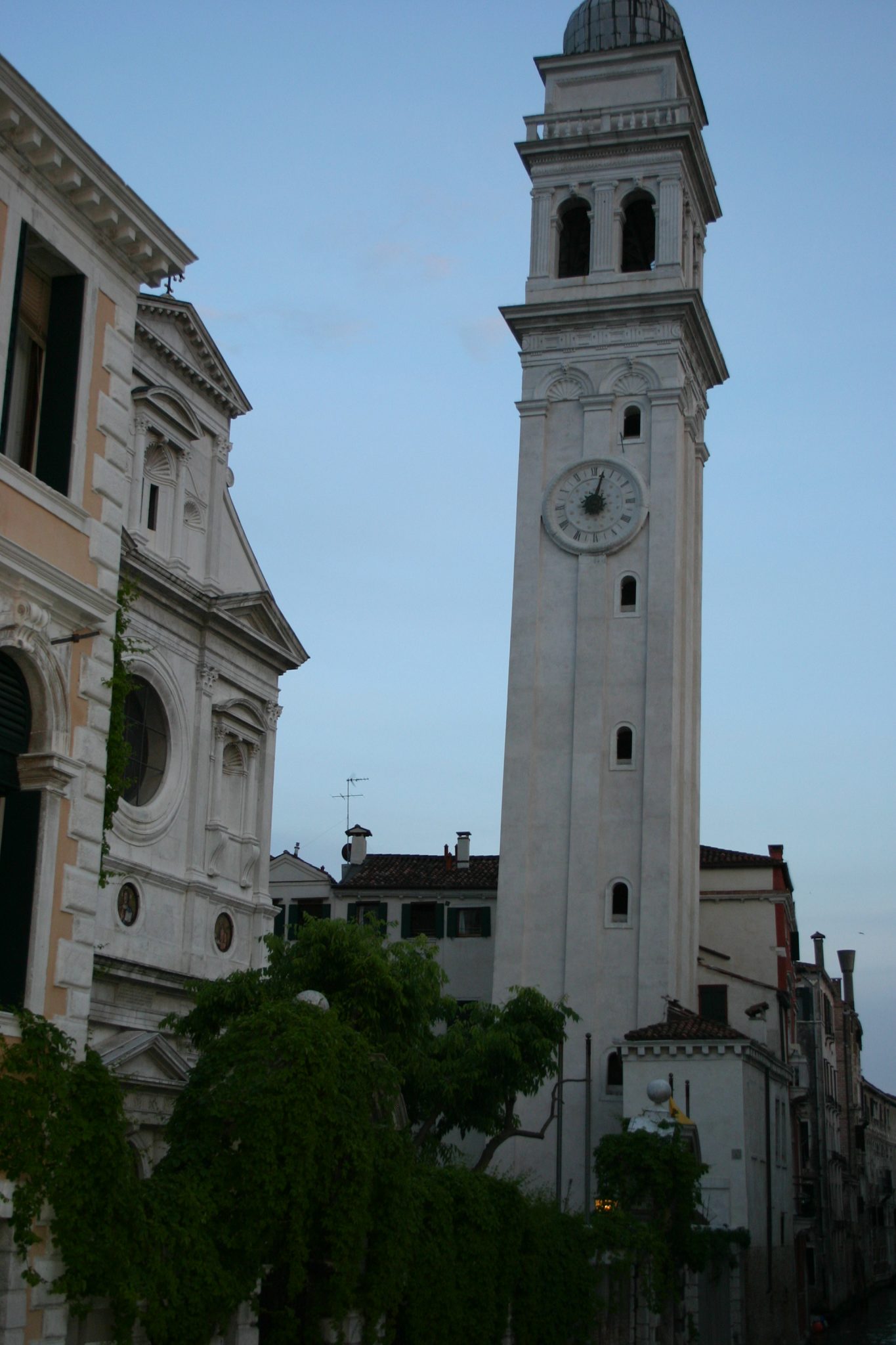Alternative Text: A tall, white clock tower stands prominently in the image, with a round clock face displaying Roman numerals. The tower is flanked by historic buildings with ornate architectural details, including stonework and arched windows.