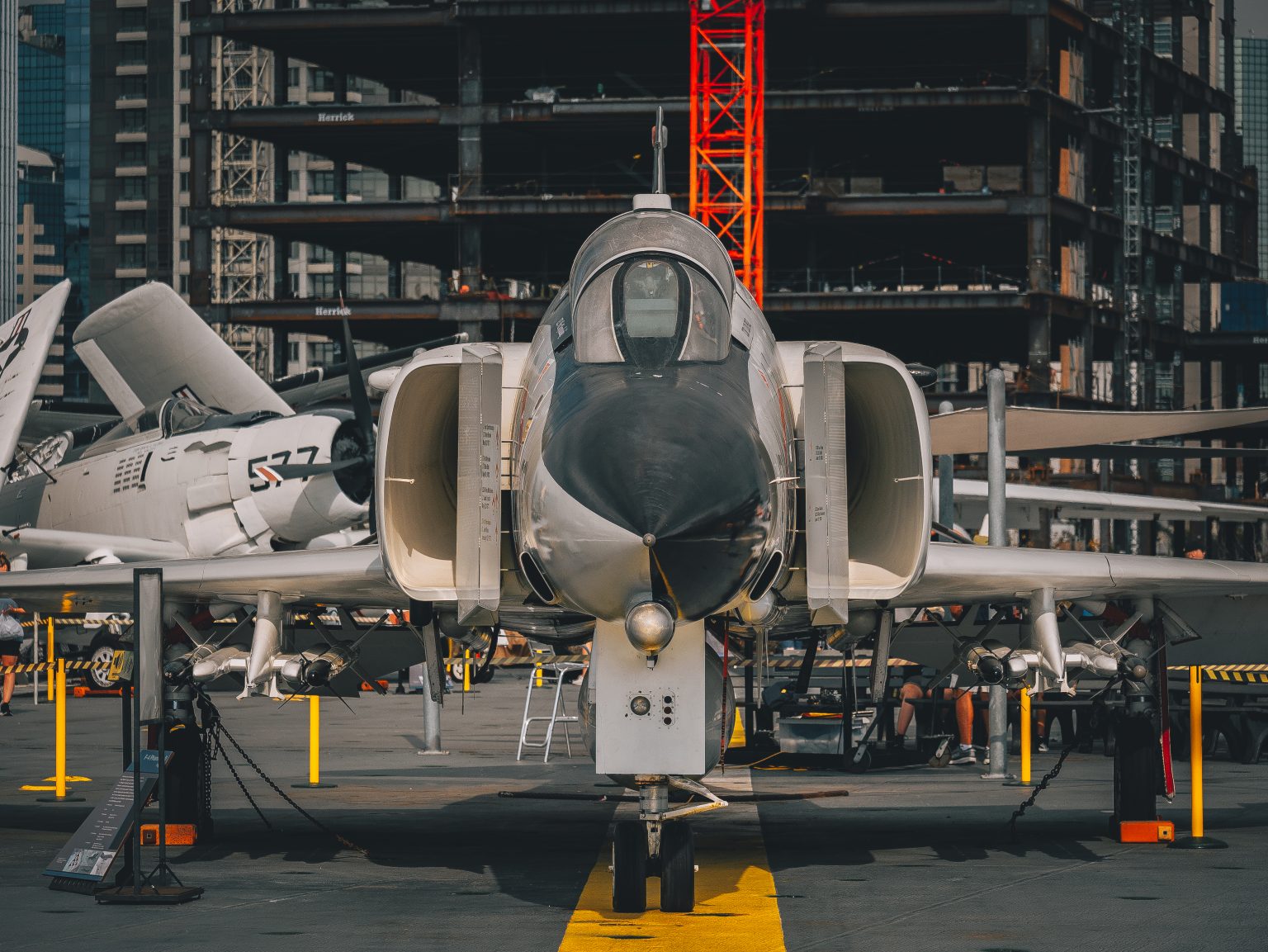 Alternative Text: Front view of F-4 Phantom II on the deck of the USS Midway in San Diego