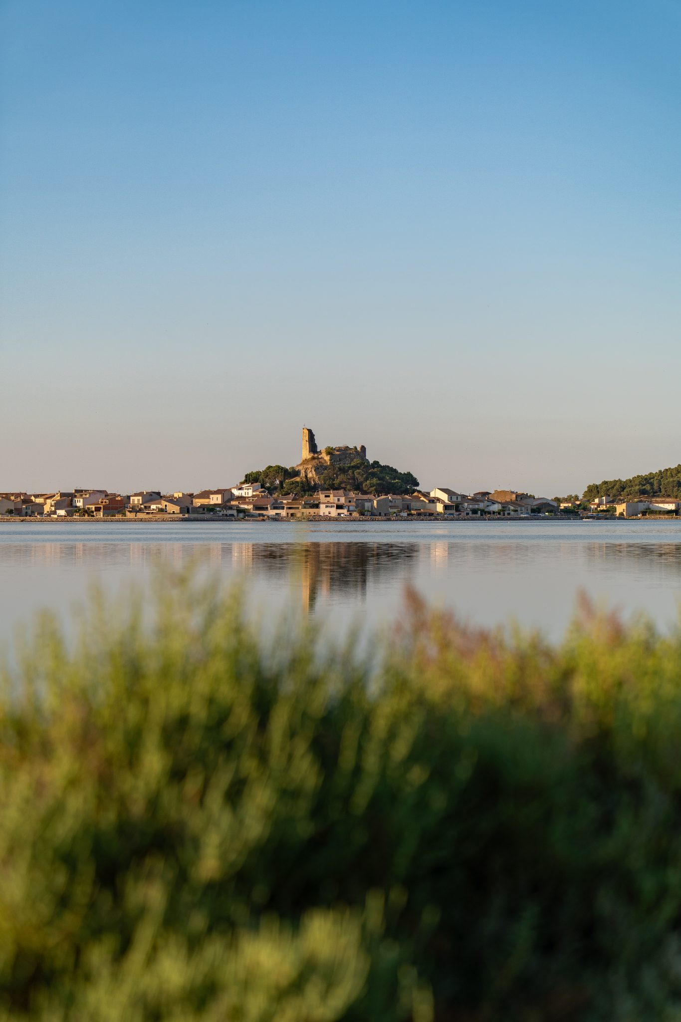 Alternative Text: The castle of Gruissan in the soft morning light – calm and clear above the Etang de Gruissan.