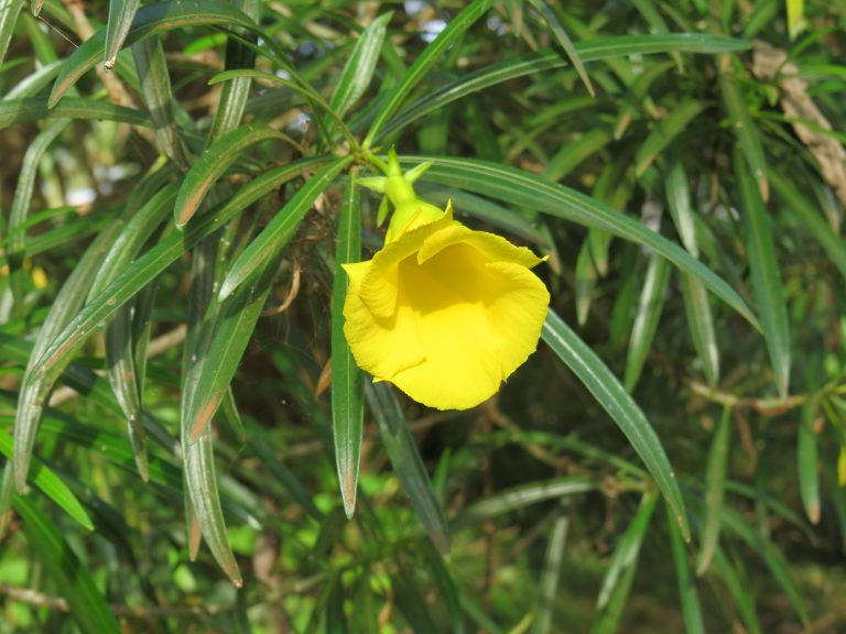 Alternative Text: Bright yellow bell-shaped flower hanging from a branch, surrounded by long slender dark green leaves forming a dense background pattern.
