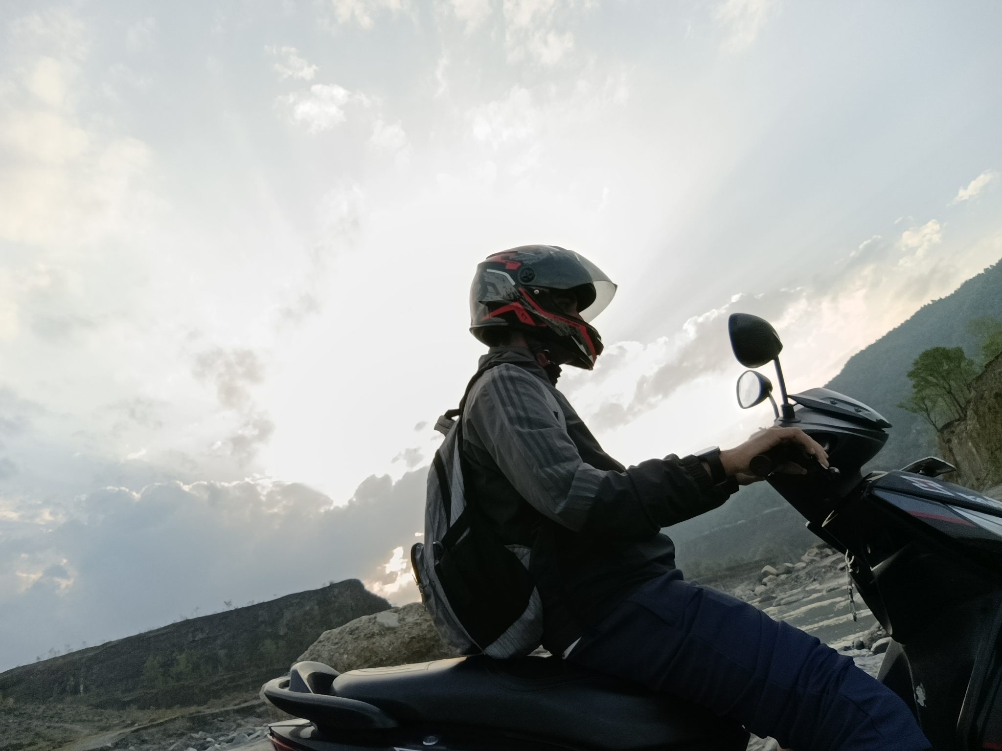 Alternative Text: A person wearing a helmet and backpack is riding a scooter on a rocky terrain, with a hilly landscape in the background.