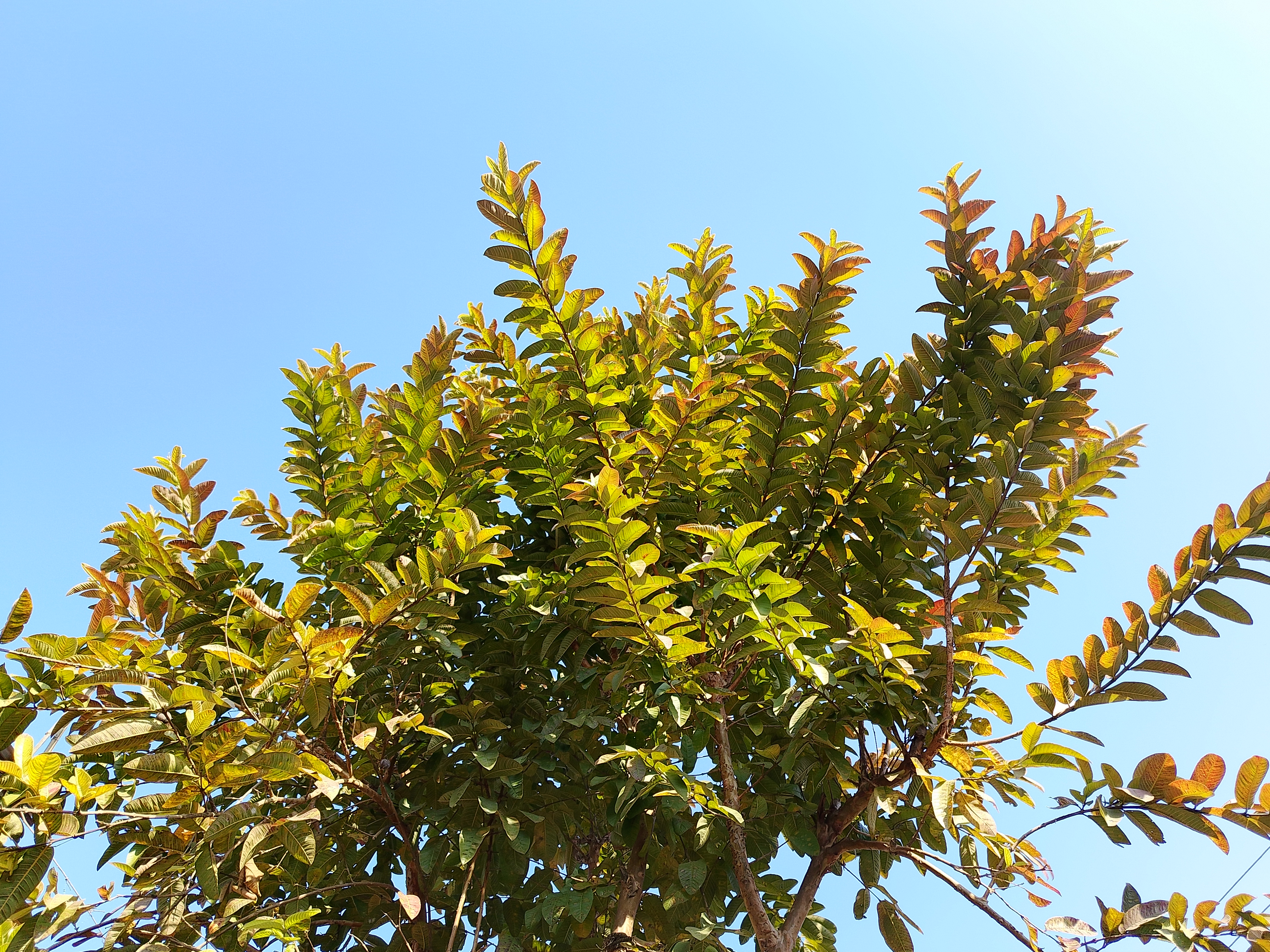 Alternative Text: A vibrant green tree with glossy leaves extending toward a clear blue sky. The leaves exhibit varying shades of green, with some edges tinged in orange.