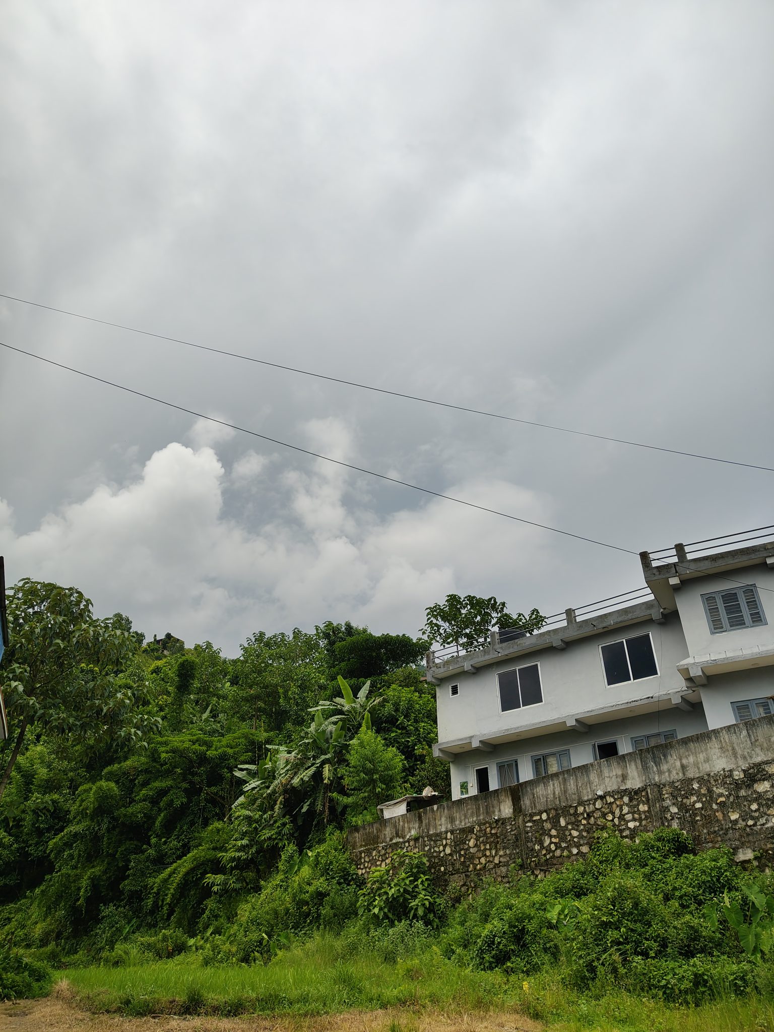 Alternative Text: A white two-story house sits beside a green, lush hillside with tropical plants and trees.