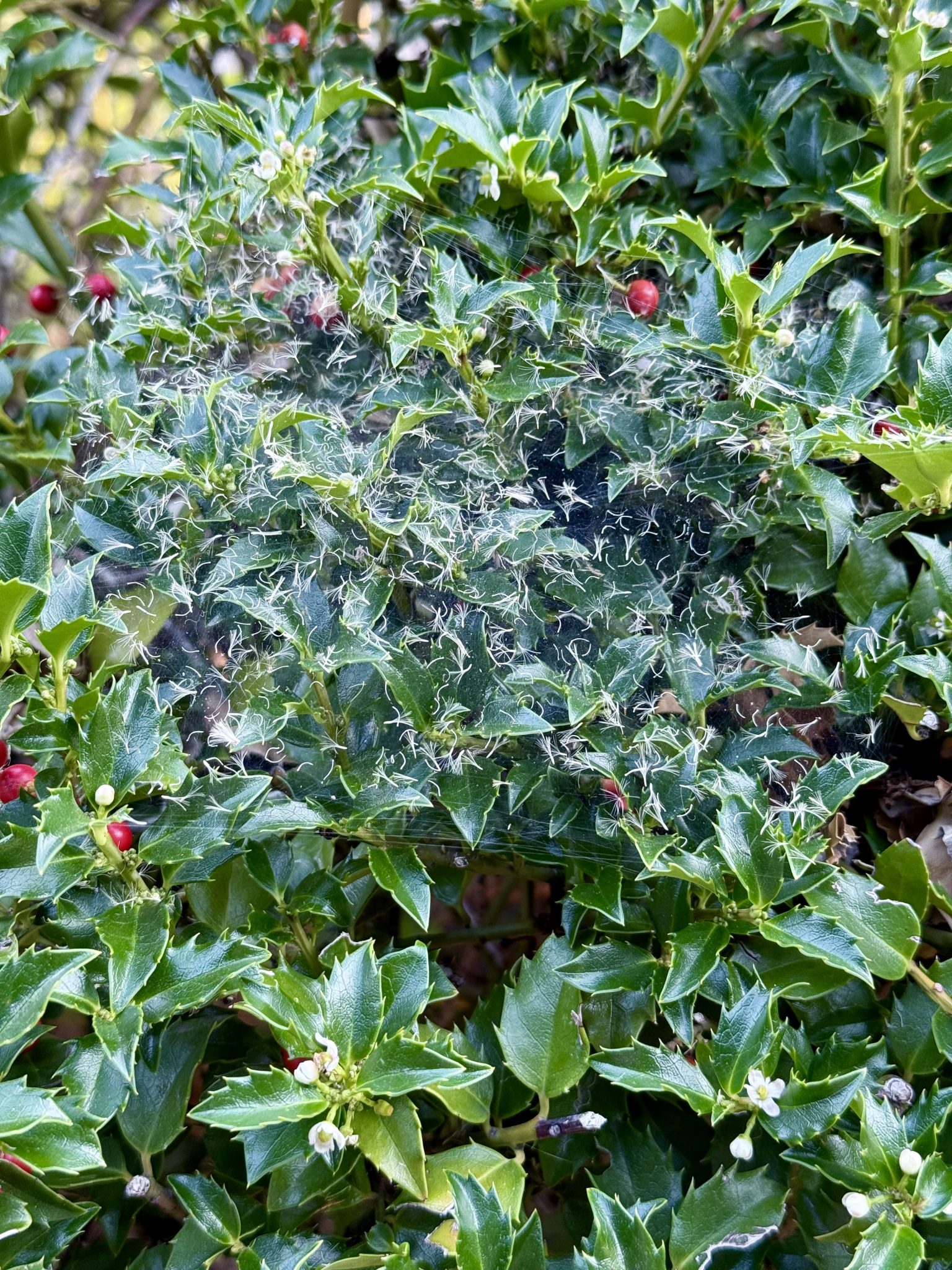 Alternative Text: A thick spider web with trapped plant fluff spread across the spiky green leaves of a holly bush with red berries, captured near Tilikum Crossing Bridge, Portland.
